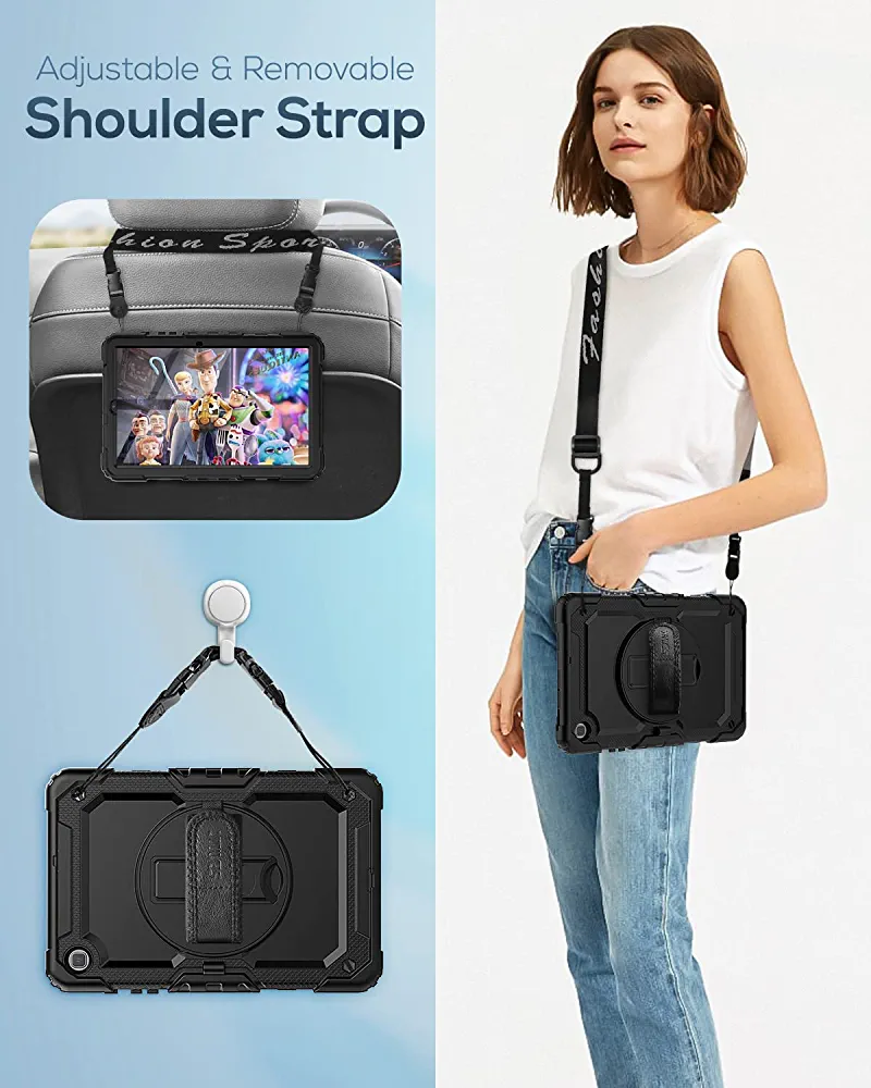 🍀【EASY-TO-USE HAND & SHOULDER STRAP】- With the adjustable handle on the back, you can hold your tablet securely with single hand, and let your other hand free do other things. The adjustable and removable shoulder strap is kids-friendly for carrying the device, it also could hang on the headrest of car seat or wherever you want.