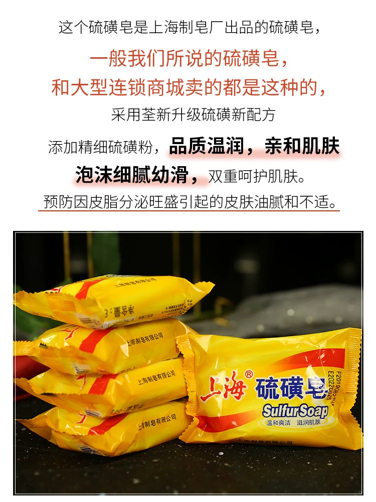 | nameOriginal | Shanghai sulfur soap for face washing, bathing, hair washing, sulfur soap, bezoar soap, facial washing soap, mite removal and oil control soap |
