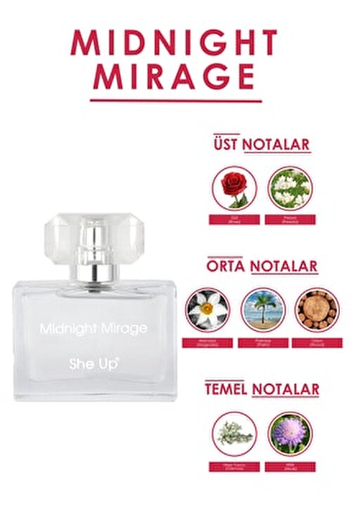 Midnight Mirage Women Perfume 50 Ml Fragrance Influence Around You… SHE UP Quality is waiting for you with fragrances that add color to your style. Top Notes: Rose and Fresia and Floral Fragrances are waiting for you. Middle Notes: Daffodil, Palm and Wood Fragrance in Middle Notes are waiting for you. Bottom Notes: Oak Moss and Musk Smell Awaits You in the Bottom Notes.