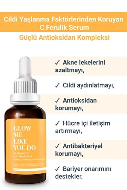 WHAT IS GLOW ME LIKE YOU DO – 4% Vitamin C + 0.5% Ferulic Acid (30 ml)? Glow Me Like You Do aims to nourish the skin while at the same time refreshing it. It provides skin revitalization, brightening and helps reduce fine wrinkles. EFFECT: Provides a vibrant and healthy skin appearance. It reduces the appearance of skin, wrinkles and has an anti-aging effect. It restores and strengthens the skin barrier. Reduces the appearance of dark spots on the skin. Provides moisture balance of the skin. SCIENTIFIC FORMULA: Vitamin C is one of the essential essential antioxidants for the skin. Formulated by enriching Glow Me Like You Do, Vitamin C, Ferulic Acid. Helps moisturize the skin with Hydrolite® 5 Green while providing skin revitalization and brightening. FOR WHICH SKIN TYPES ARE SUITABLE? It is suitable for use on all skin types except for skin with very sensitive, eczema, rashes, irritated and active acne. WHO SHOULD USE IT? People who want to have a brighter skin, People who have skin where acne has been replaced by blemishes while healing after acne treatment, People who have blemish problems on their skin, Suitable for skin that needs anti-aging care. HOW TO USE IT? Applied as the first step of skin care after skin cleansing. Suitable for use in the daily routine. Apply 1-2 drops of the product on the face in a thin layer. In your skin care routine, it is recommended to use it in the morning and evening. As the last product in daytime use, sunscreen must necessarily be applied. WARNINGS: For external use only. Do not neglect to use sunscreen from the moment you start using the product. Before use, apply the product to a small part of your skin to avoid possible unwanted side effects and irritation, if sensitivity does not occur, continue to use the product. In case of irritation, stop using the product and please contact your dermatologist. Avoid contact around the eyes and eyes during application and rinsing procedures. In case of contact, rinse with plenty of water. Store at room temperature and in a safe place out of reach of children. EXPERT OPINION: To protect your skin from the harmful effects of UVA-UVB rays, you should make sunscreen a part of your skincare routine. INGREDIENTS: Ingredients: Aqua, Propylene Glycol, Pentylene Glycol, Sodium Ascorbyl Phosphate, 3-0-Ethyl Ascorbic Acid, Niacinamide, Glycerin, Panthenol, Phenoxyethanol, Ferulic Acid, Hydroxyethylcellulose, Edta, Citrus Lemon Peel Oil, Ethylhexylhexylllose Glycerine, Tocopheryl Acetate