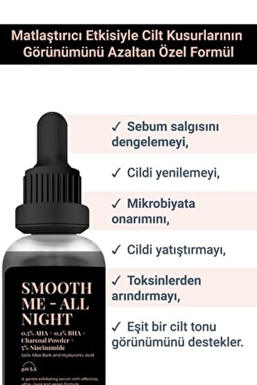 SMOOTH ME — ALL NIGHT – 0.5% AHA & 0.1% BHA + Charcoal Powder + 5% Niacinamide (30 ml) WHAT IS IT? Specially designed for oily, acne and blemish prone skin, Smooth Me-All Night provides a matting and smoothing effect that promotes barrier repair, while preventing skin sensitivity thanks to extracts with antioxidant properties. EFFECT: Provides a vivid, healthy and matte skin appearance. It restores and strengthens the skin barrier. Provides tightening in the pores. Provides smoothing of the skin. Reduces the appearance of skin imperfections. It maintains the moisture balance of the skin. SCIENTIFIC FORMULA: AHA cleanses the skin from dead cells with BHA complex while balancing sebum secretion with Activated Charcoal to control lubrication. FOR WHICH SKIN TYPES ARE SUITABLE? Suitable for all skin types except very sensitive, eczema, roseous skin. Dry and combination skin should use with our Hydra Back Baby product. WHO SHOULD USE IT? Formulated for people with textural disorders on their skin, having skin tone inequality problem, Aging symptoms and fine wrinkles, Oiliness problem, Acne prone skin. HOW TO USE IT? You can gently apply on the cleansed skin by massaging the face, neck and décolleté area except around the eyes. In your skincare routine, it is recommended to use it in the evening. WARNINGS: For external use only. Before using the product, apply the product on a small part of your skin to avoid unwanted side effects and irritation, if there is no sensitivity, you can continue to use the product. In case of the occurrence of irritation, the use of the product should be abandoned and consult a dermatologist. Avoid contact around the eyes and eyes during application and rinsing procedures. In case of contact with eyes, rinse with plenty of water. Store the product at room temperature and in a safe place out of reach of children. EXPERT OPINION: The best thing you can do to prevent skin aging is to protect your skin from UVA-UVB rays. You should make sunscreen a part of your skin care routine. INGREDIENTS: Aqua, Niacinamide, Glycerin, Pentylene Glycol, Propylene Glycol, Zinc PCA, Salix Alba Bark Extract, Centella Asiatica Leaf Extract, Hydroxyethylcellulose, Hamamelis Virginiana Leaf Extract, Beta Glucan, Aloe Barbadensis Leaf Extract, Althaais Levisticum Officinale Extract, Levisticum Officinale Extract, Phenethyl Alcohol, Glycolic Acid, Salicylic Acid, Citric Acid, Lactic Acid, Tartaric Acid, Caprylhydroxamic Acid, Sodium Hyaluronate Crosspolymer, Hydrolyzed Glycosaminoglycans, Sodium Hyaluronate, Hydrolyzed Hyaluronic Acid, Yaluronic Acid, Charcoal Powder