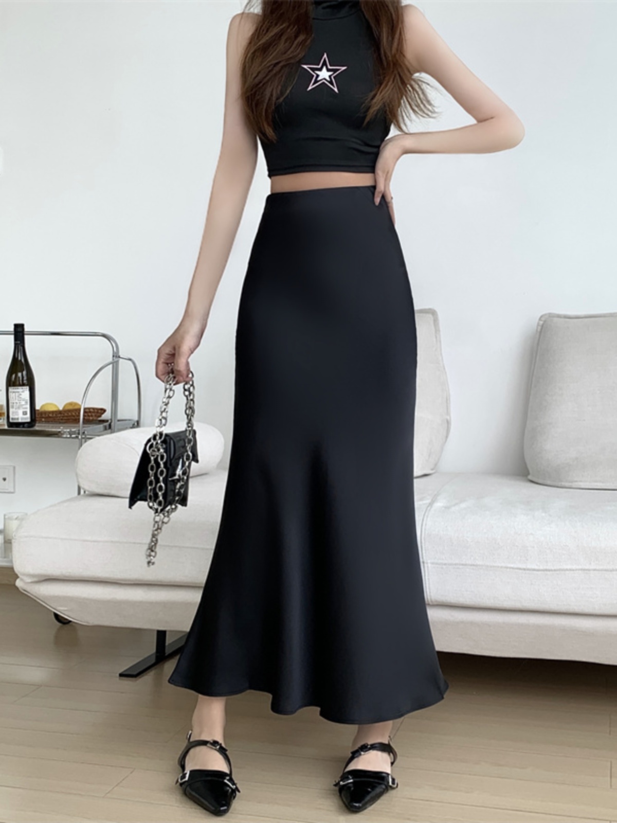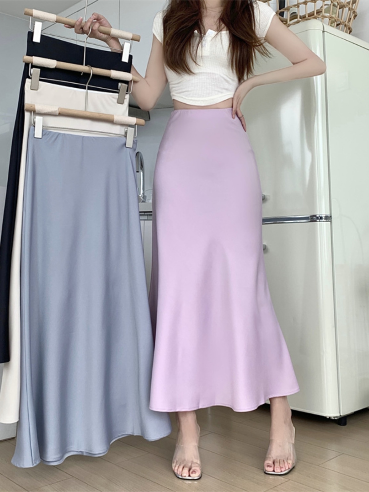 | nameOriginal | Sheath Fishtail Skirt Long Skirt Women's 2024 Summer New Style Skirt Small Acetic Satin High Waist Slimming Skirt |