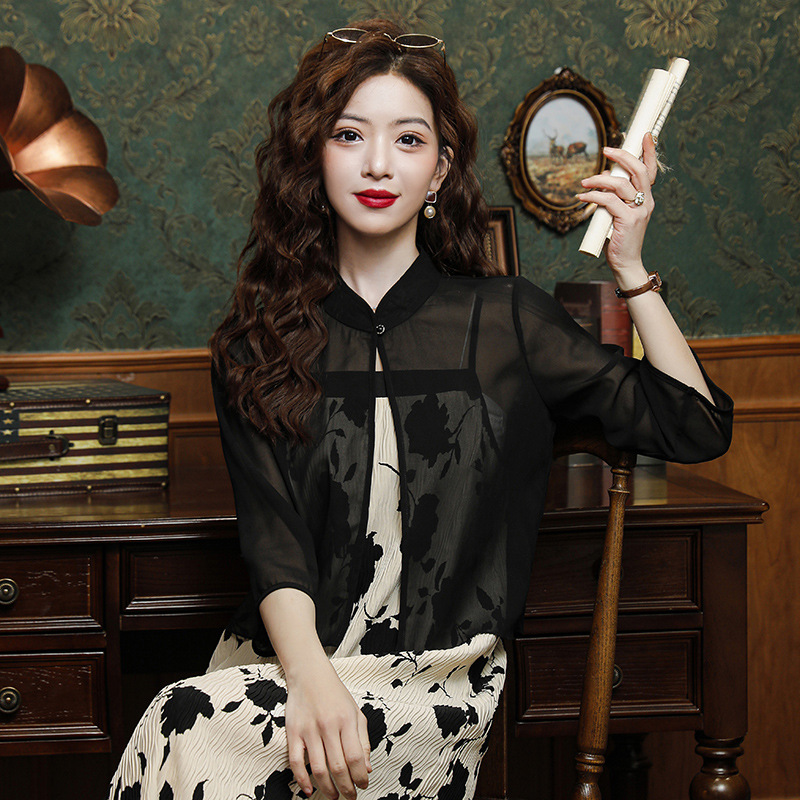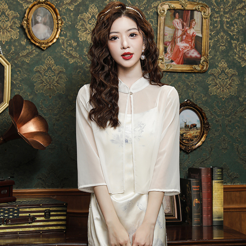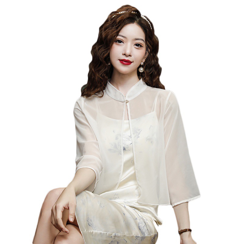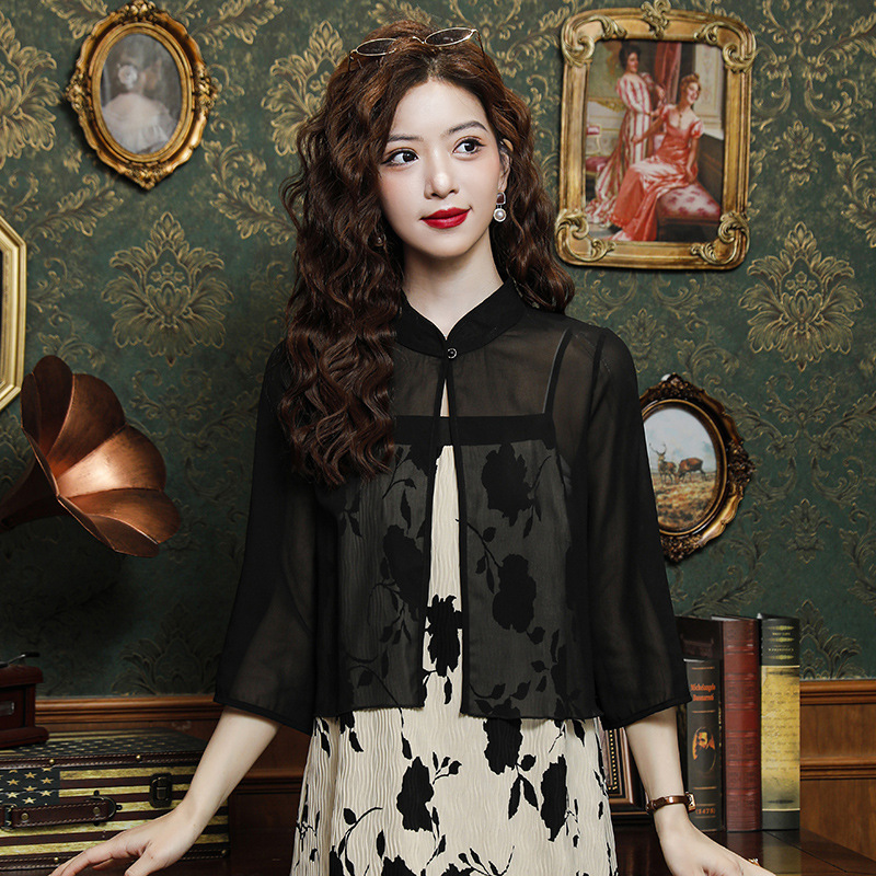 | nameOriginal | Shipped New Chinese Style National Style 2024 Summer New Chiffon Shawl Cardigan Loose Standing Collar High-end Sense |