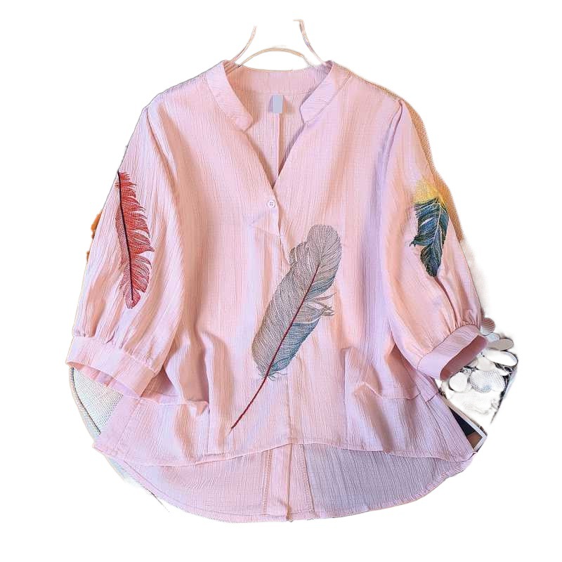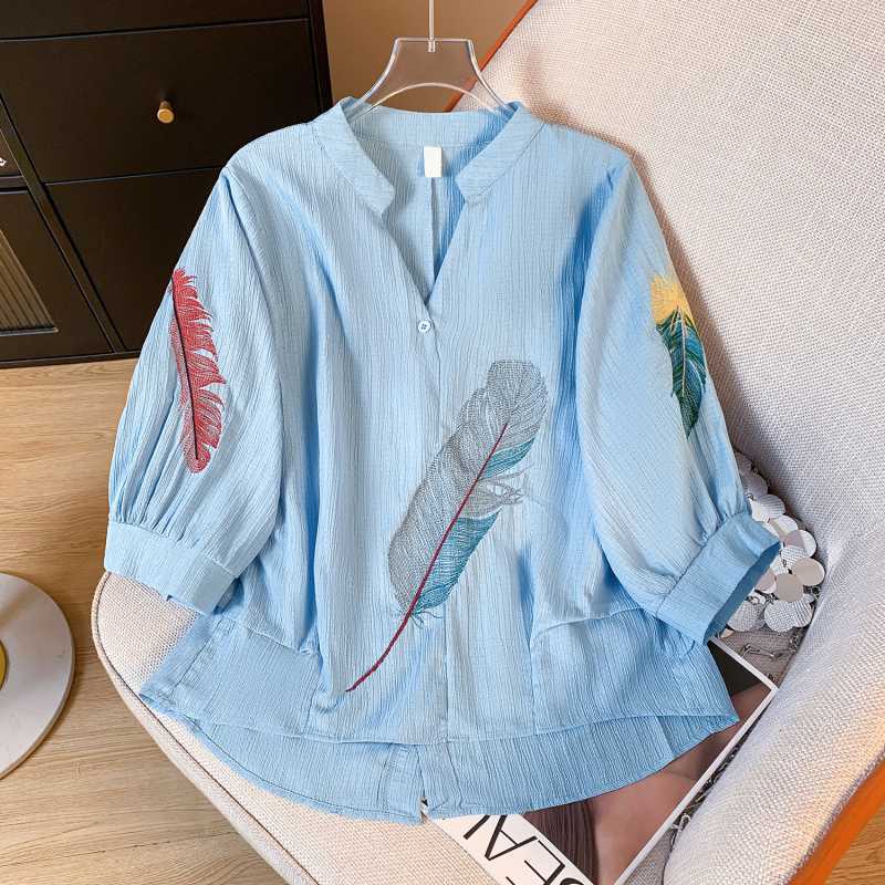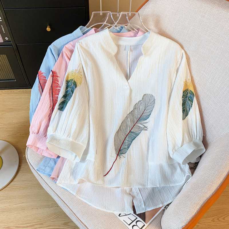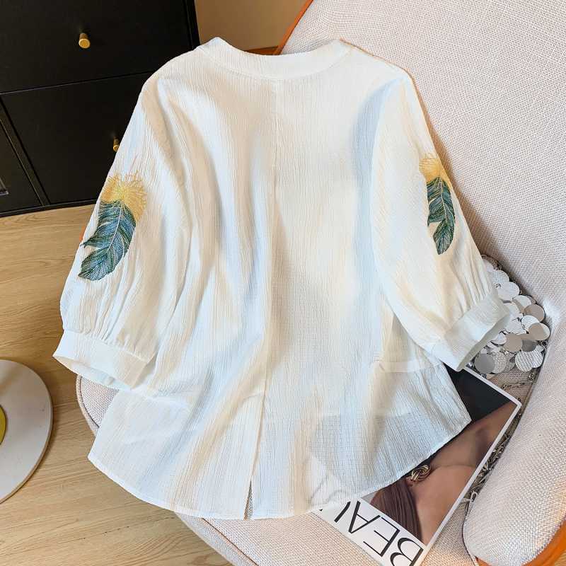 Shirt Women’s White Summer Embroidery Short V-Neck Seven-point Sleeve All-match Sweet Pastoral Style Slimming Top with Collarbone
