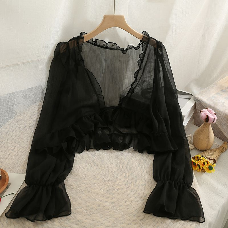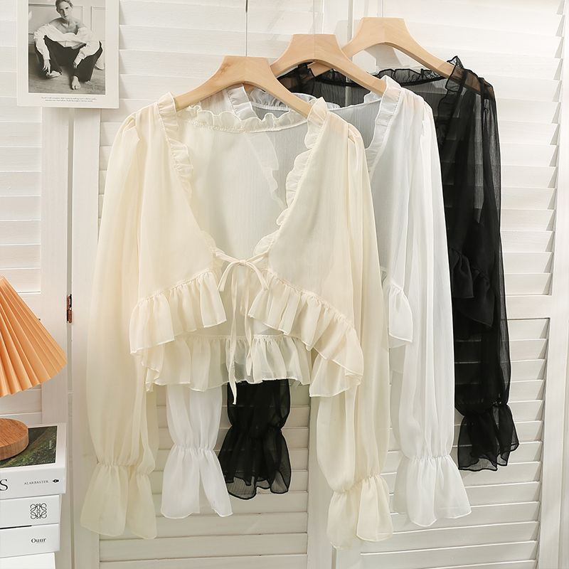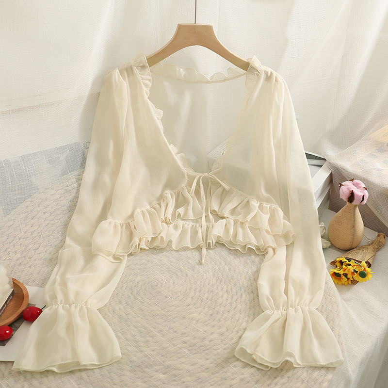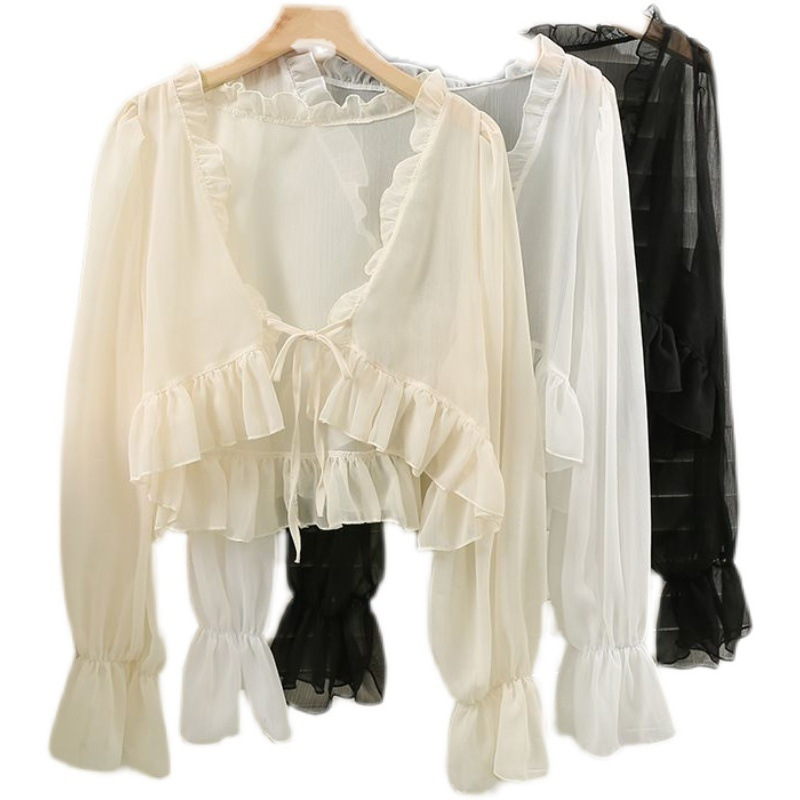 Short Chiffon Sun-screen Shirt with Bow and Wood-ear Edge for Women 2024 Summer New All-match Sun-screen Shirt Small Shawl