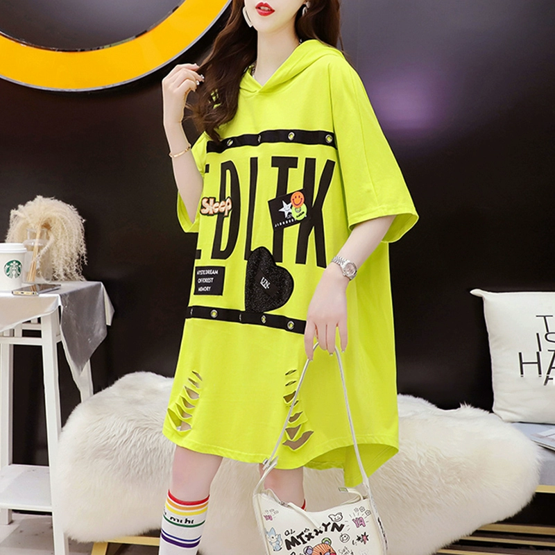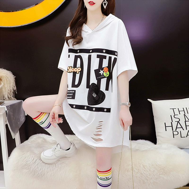 Short-front and long-back hooded T-shirt women’s short-sleeved summer new loose large size mid-length ripped letter printed top