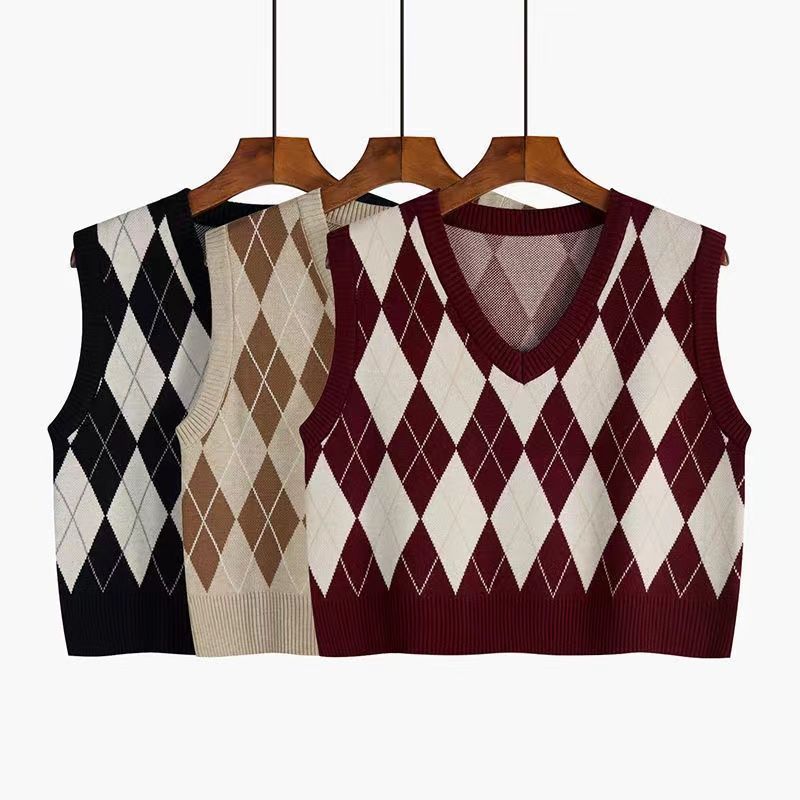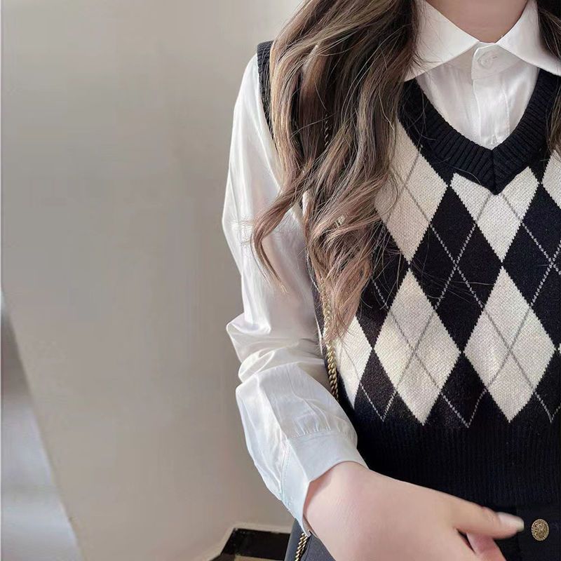 Short Rhomboid Vest Women's Spring and Autumn New 2023 Sweet College-style Knitted Sweater Vest Overlap Shirt