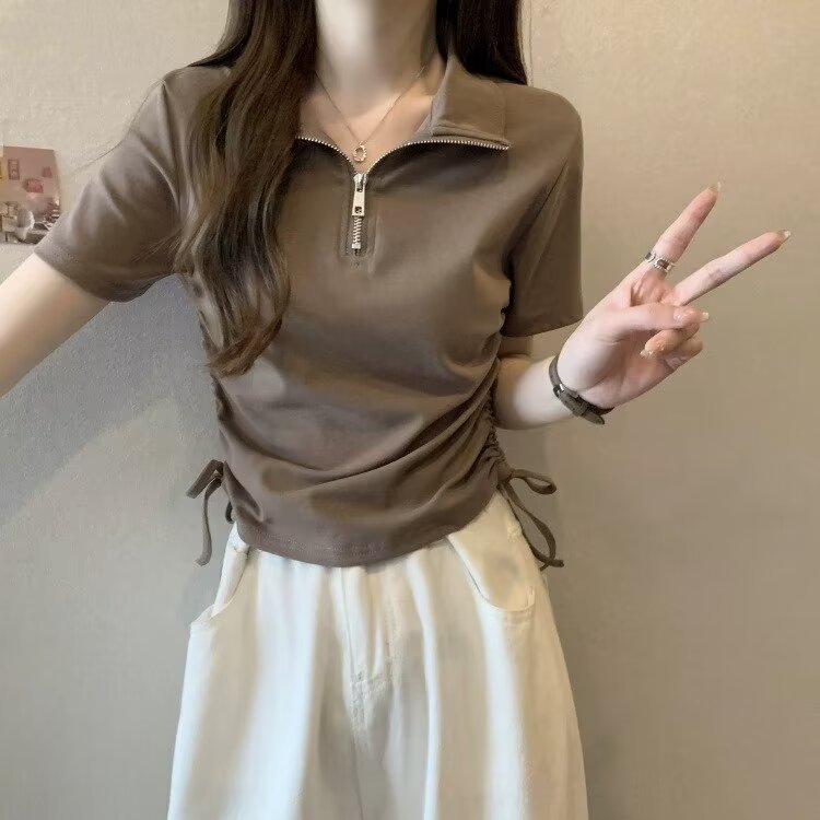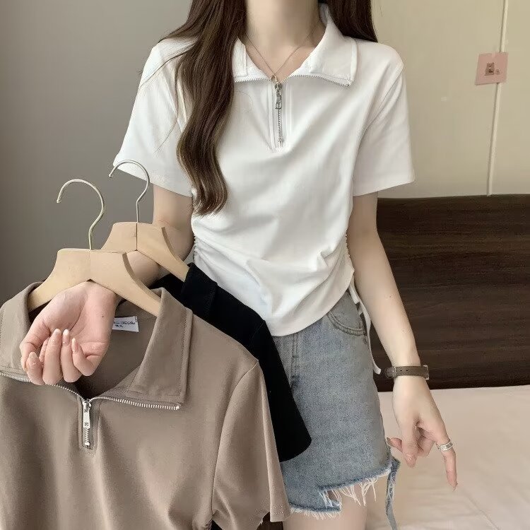 Short Sleeve Front Shoulder POLO Collar T-Shirt Women’s 2024 Summer New All-match Half Zipper Slim-fit Short Drawstring Top