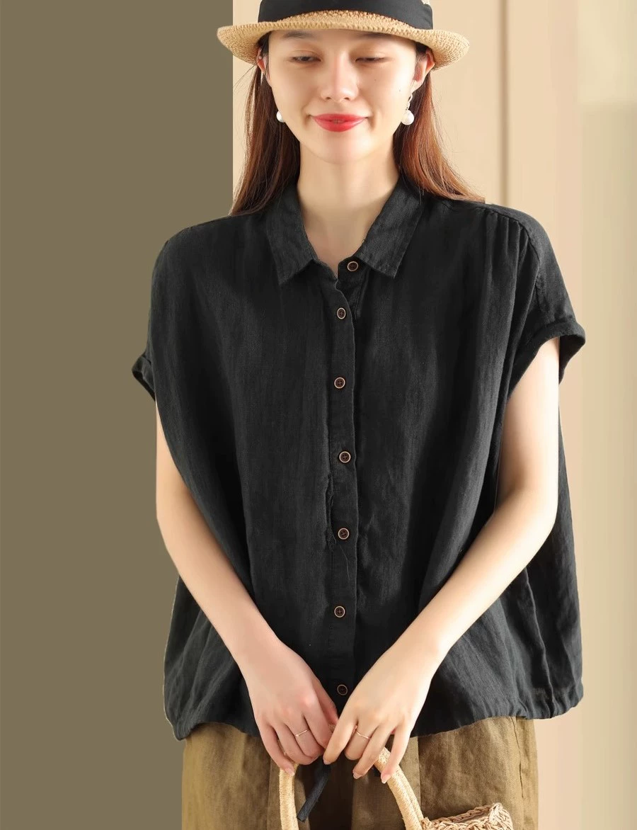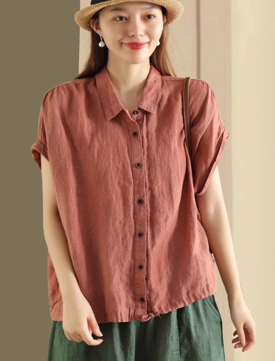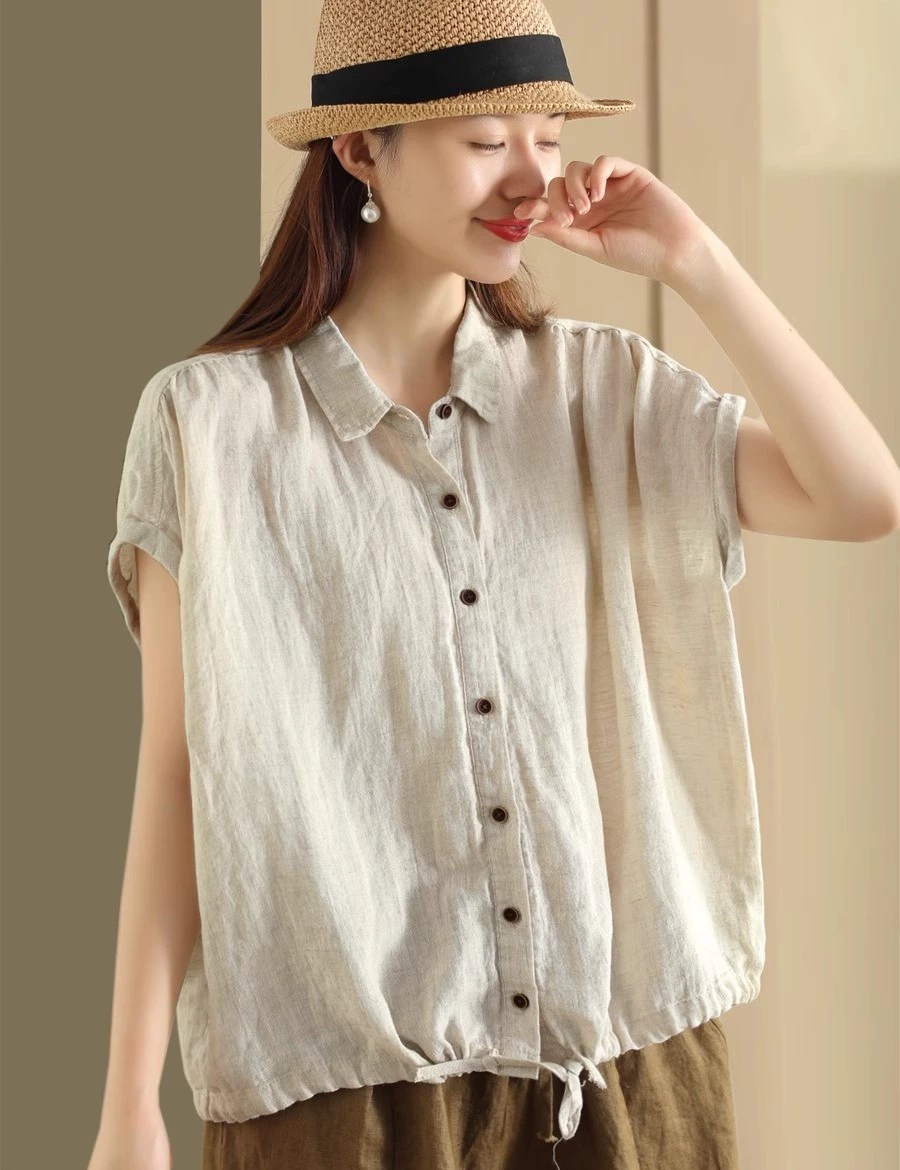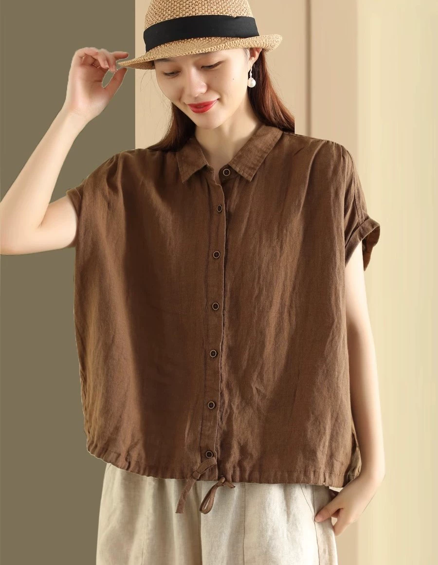 Short -sleeved loose casual cardigan pecker drawstring linen linen
