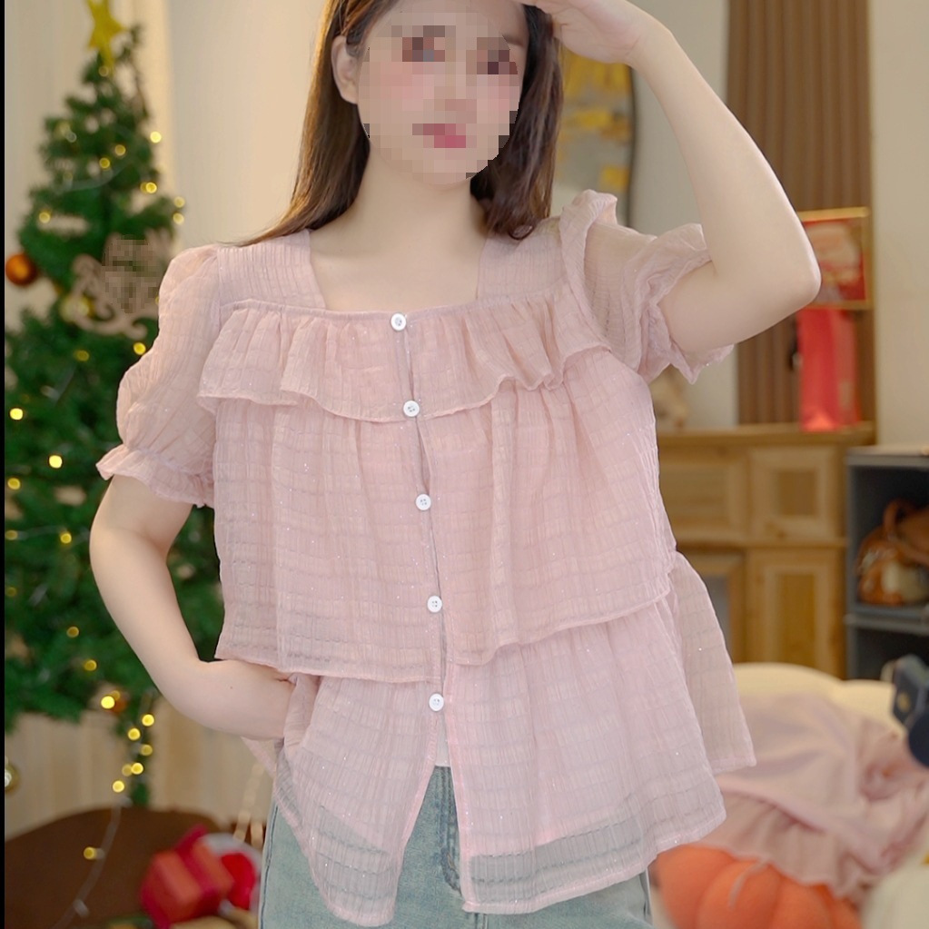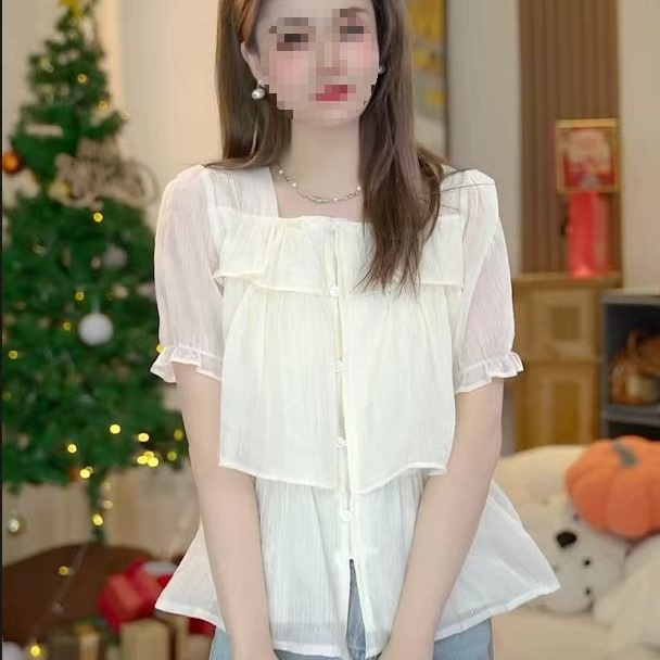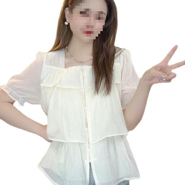 Short Sleeve Summer New Style Small Shirt Sweet Ruffled Square Collar Small Top Fairy Princess pink apricot Other
