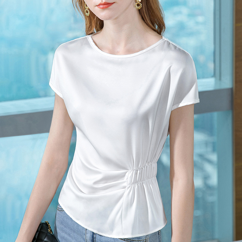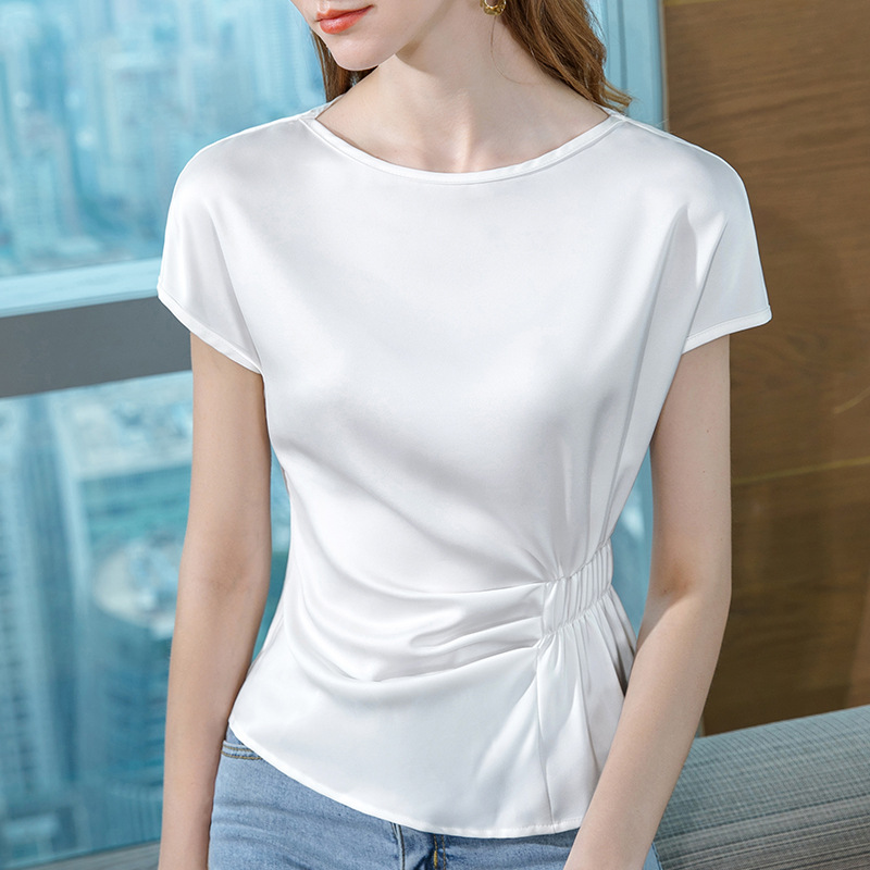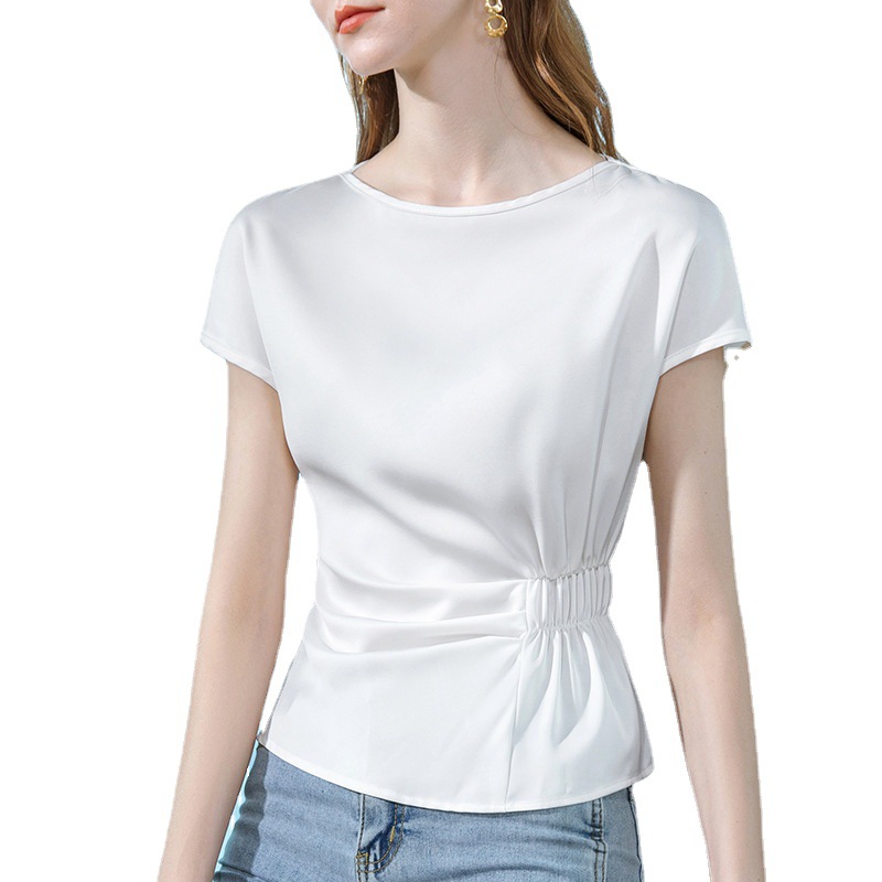 | nameOriginal | Short-sleeved chiffon shirt women's summer 2024 latest women's high-end silky satin blouse French pleated waist top |