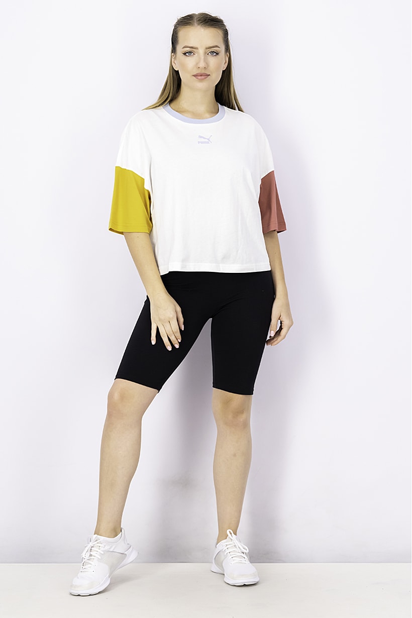 This product is easy to care for as it is machine washable. It has a sportswear fit and is available in US sizes. The fabric is light and suitable for training. The hem is straight and the sleeves are short. Please note that the product color may appear slightly different due to lighting or monitor settings. It is made of 100% cotton and features a colorblock pattern with a brand logo. This is a top that falls under the sportswear category and is available in white.