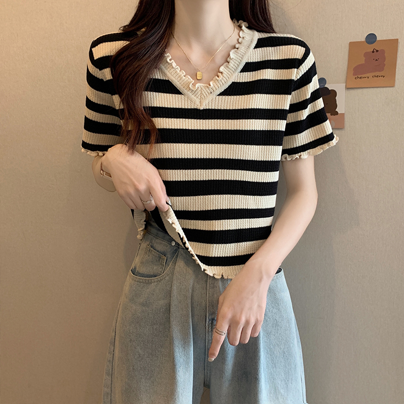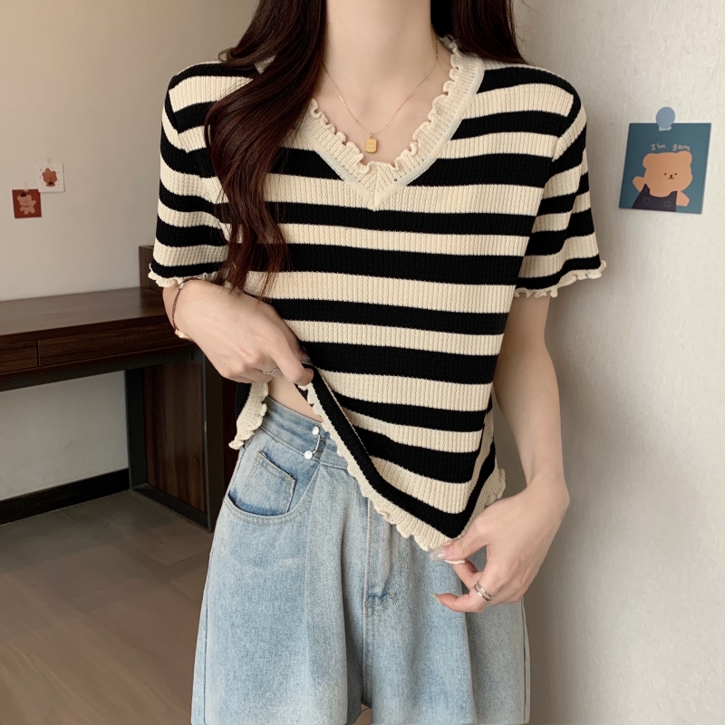 | nameOriginal | Short-sleeved Ice Silk Striped T-shirt Women's Short Western-style Beautiful Small Shirt Summer Wear plus size chubby girl Slim Shoulder V-neck Top |