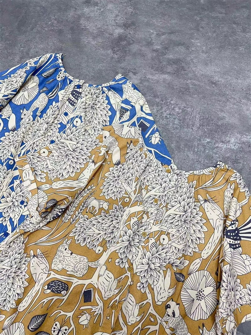 Short-sleeved ink print dress for women 2024 summer new sweet round neck pure cotton mid-length thin shirt dress