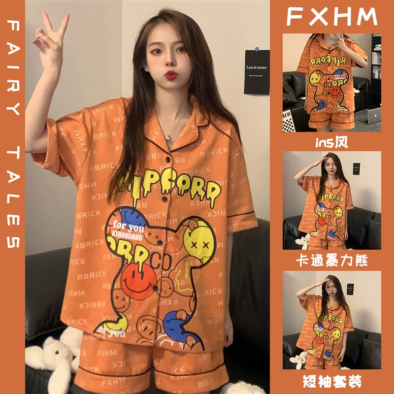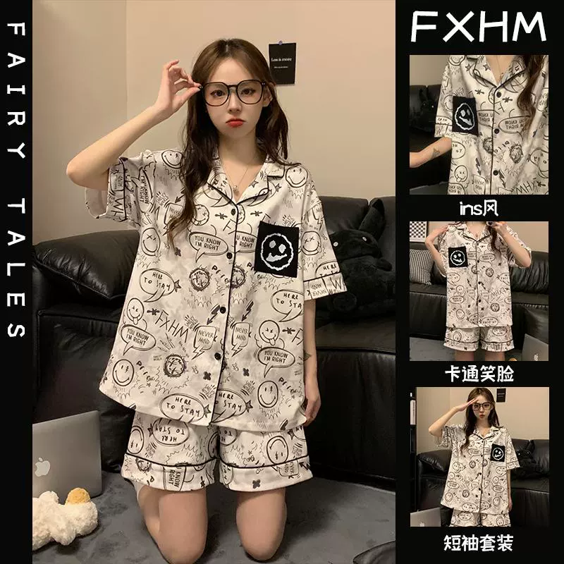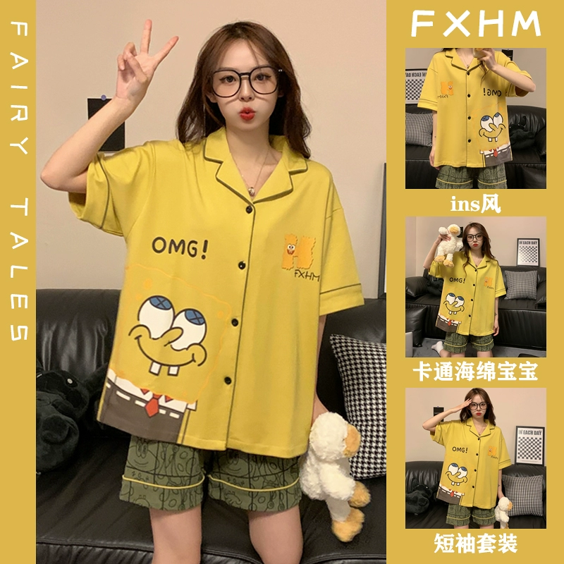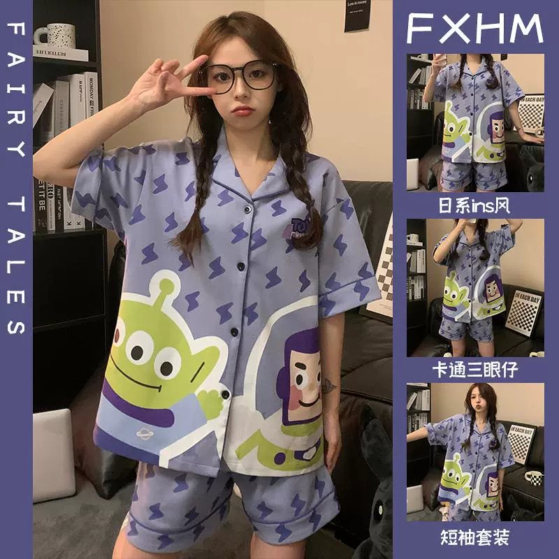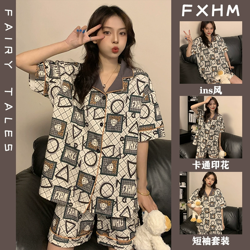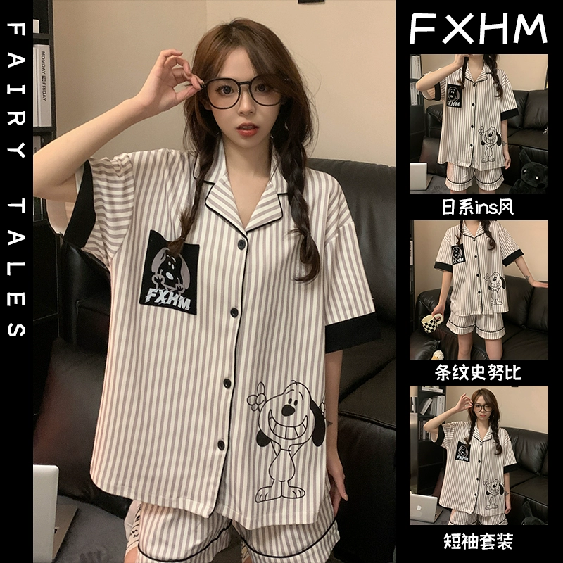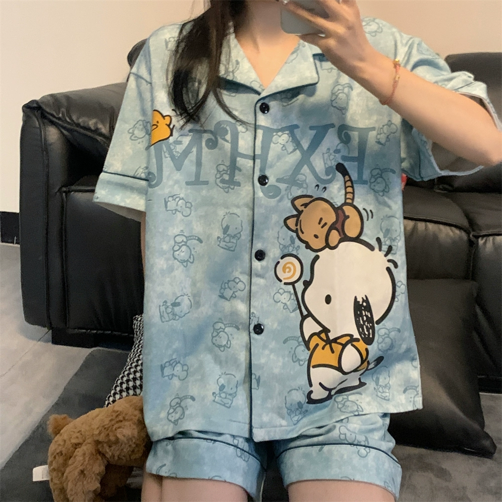 Short-sleeved pajamas for women summer ins student style cartoon print thin lapel plaid pacha dog home wear set