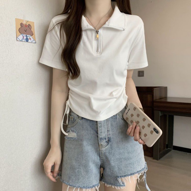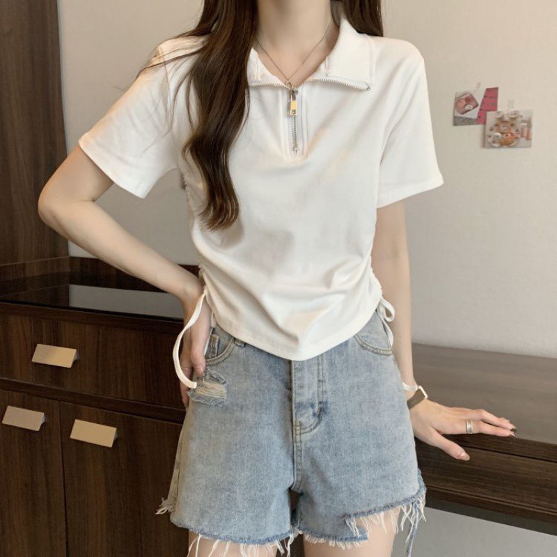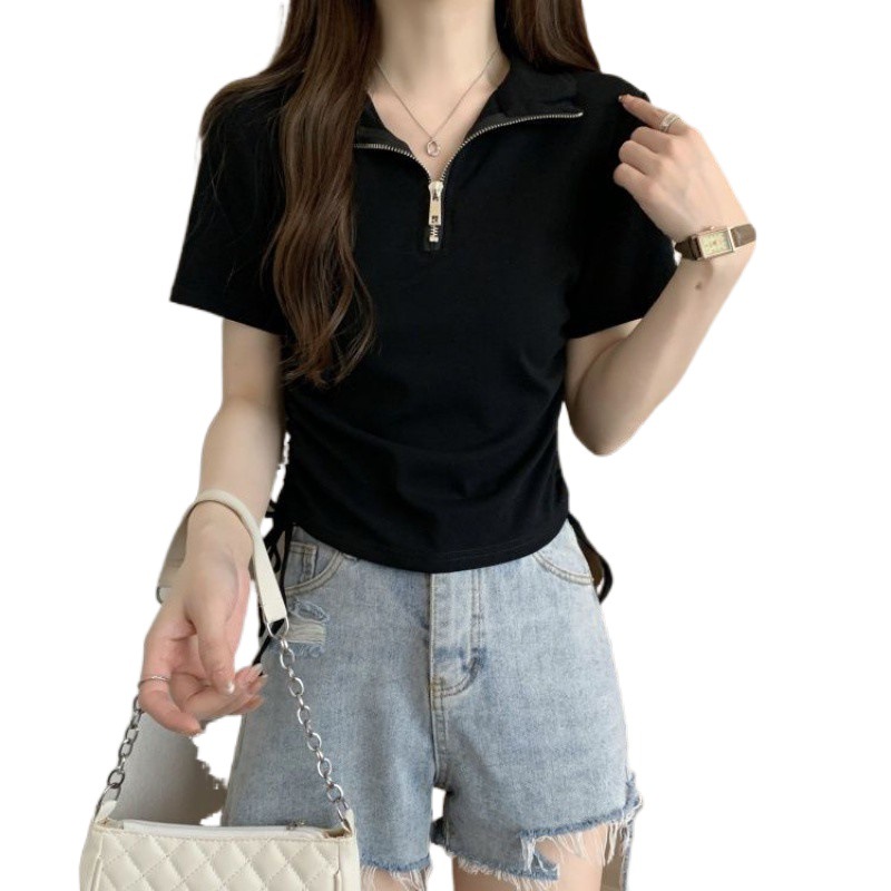 | nameOriginal | Short-sleeved Shoulder T-shirt Women's Summer 2024 New French Style Polo Collar Unique and Chic Short Drawstring Top with Zipper |