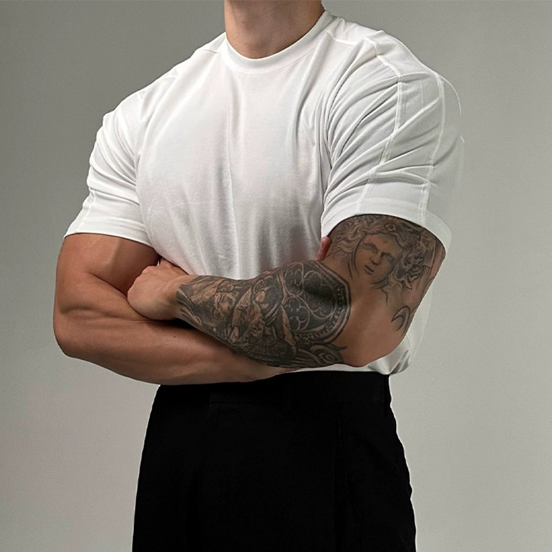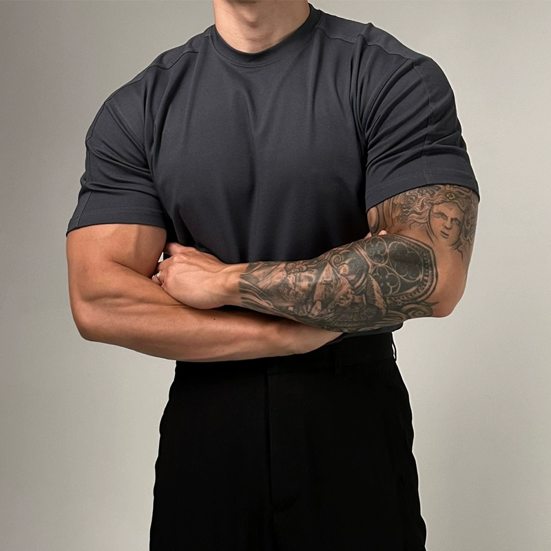 Short-sleeved T-shirt for men in summer, casual, slim-fitting, figure-retracting cuffs, round neck, sports running training, bulking up fitness clothes