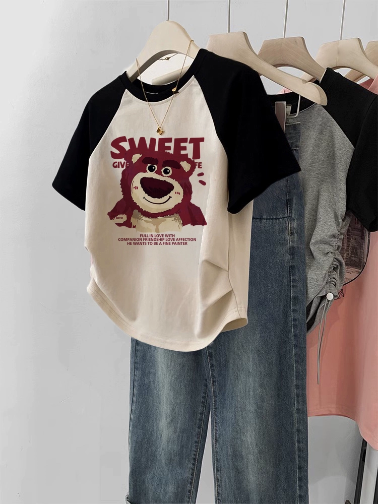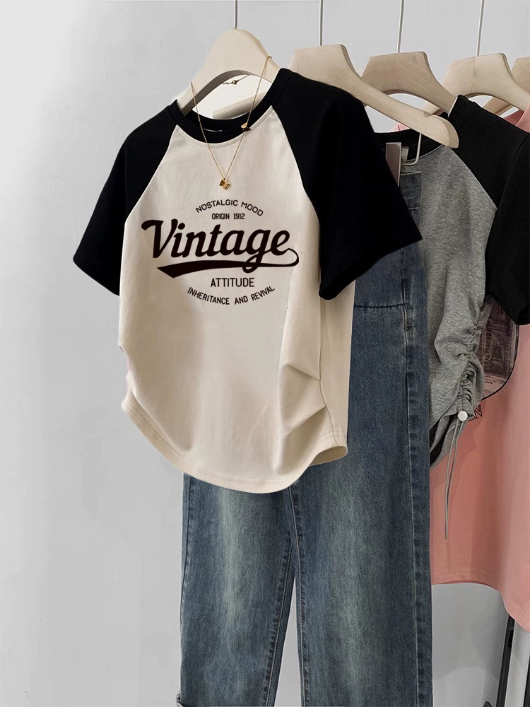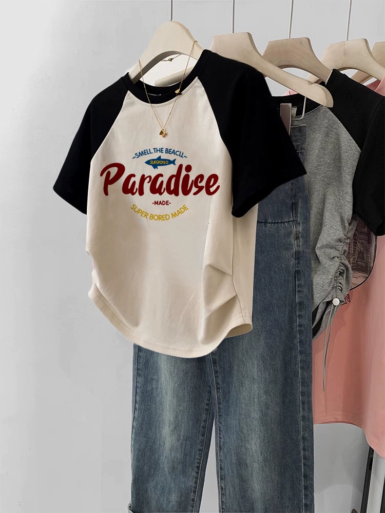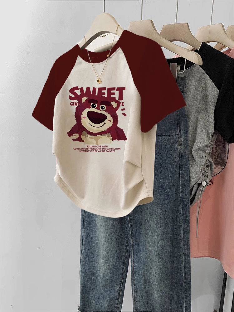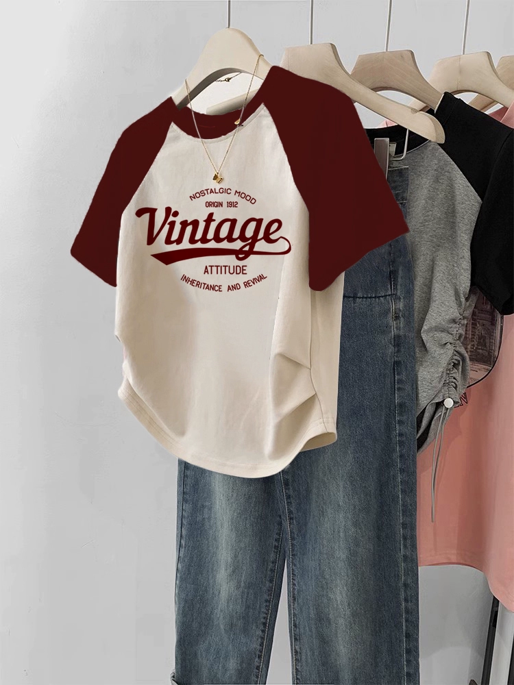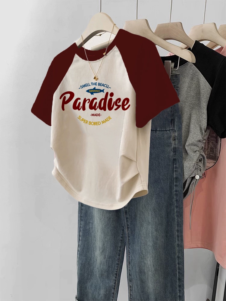 | nameOriginal | Short-sleeved T-shirt for women 2024 new summer right shoulder burgundy raglan sleeves large size slim short sweet and spicy top |