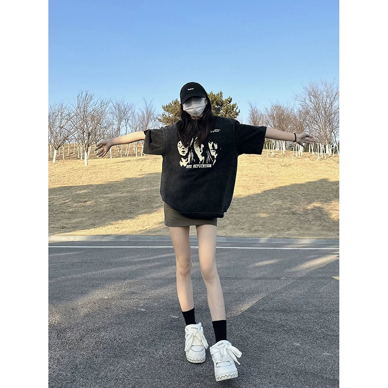 | nameOriginal | Short-sleeved t-shirt for women, summer, pure cotton, loose, washed, distressed, trendy brand printed, half-sleeved, American top, large size, slimming for fat mm |