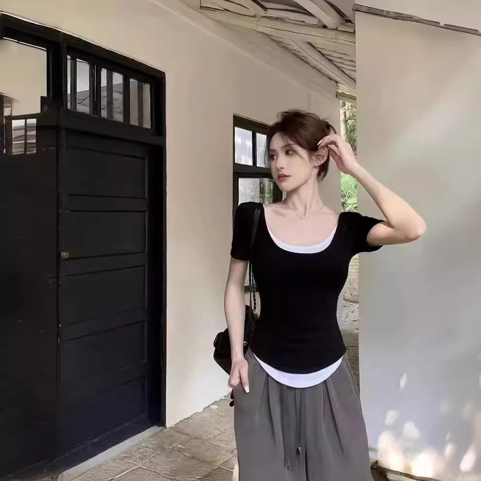 | nameOriginal | Short-sleeved T-shirt Women's Summer 2023 New Fake Two-piece Niche Design Sense All-match Pure Desire-style Slim-fit Short Top |