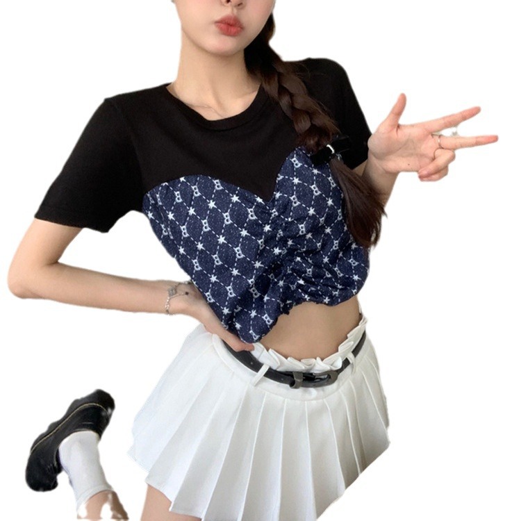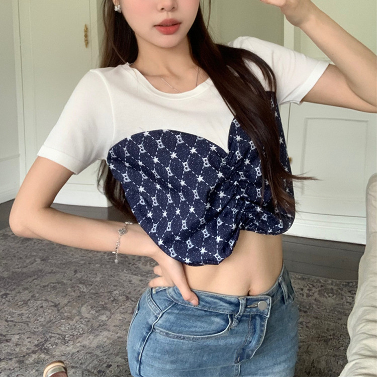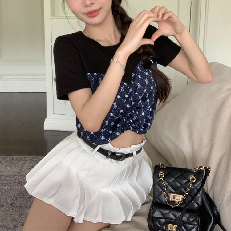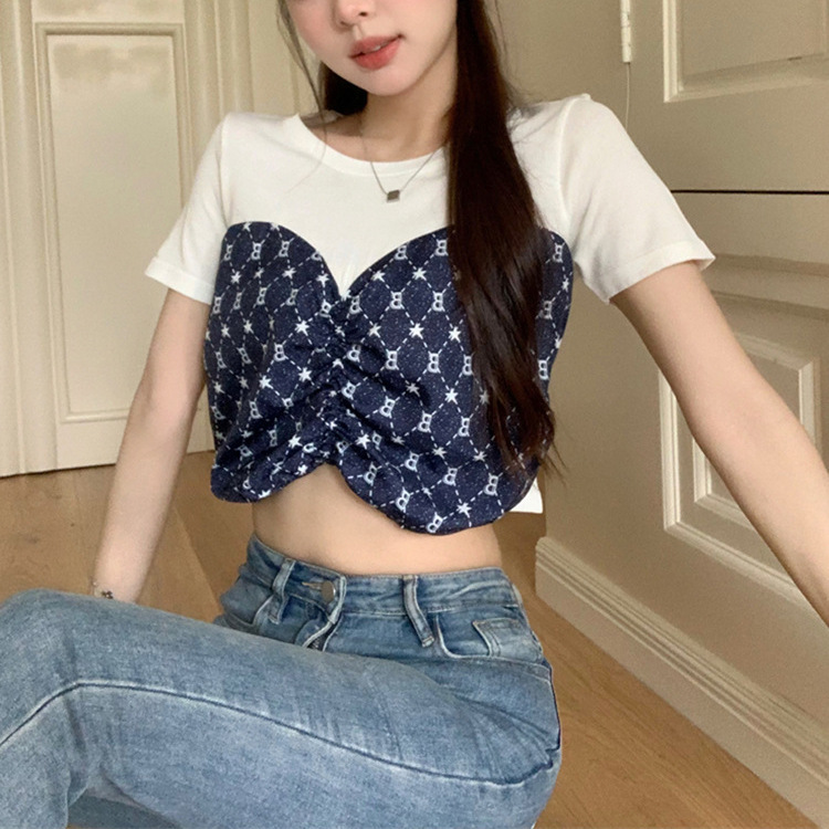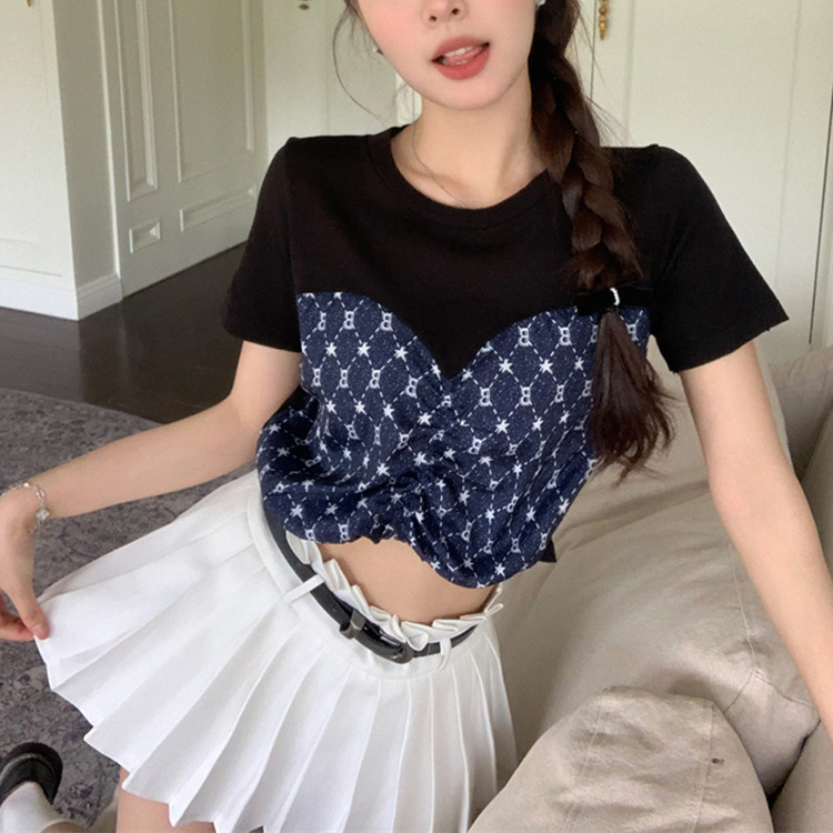 Short-sleeved T-shirt women’s summer 2024 new Denim stitching design niche fashion foreign style fake two-piece top