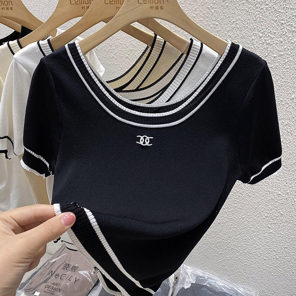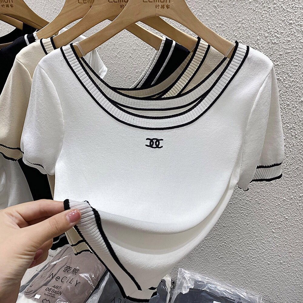 Short-sleeved T-shirt Women's Summer Ice Silk Knitted Base Shirt Half-sleeved 2024 New Round Neck Short High Waist Top