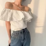Short-sleeved white summer fairy collarbone ruffle top