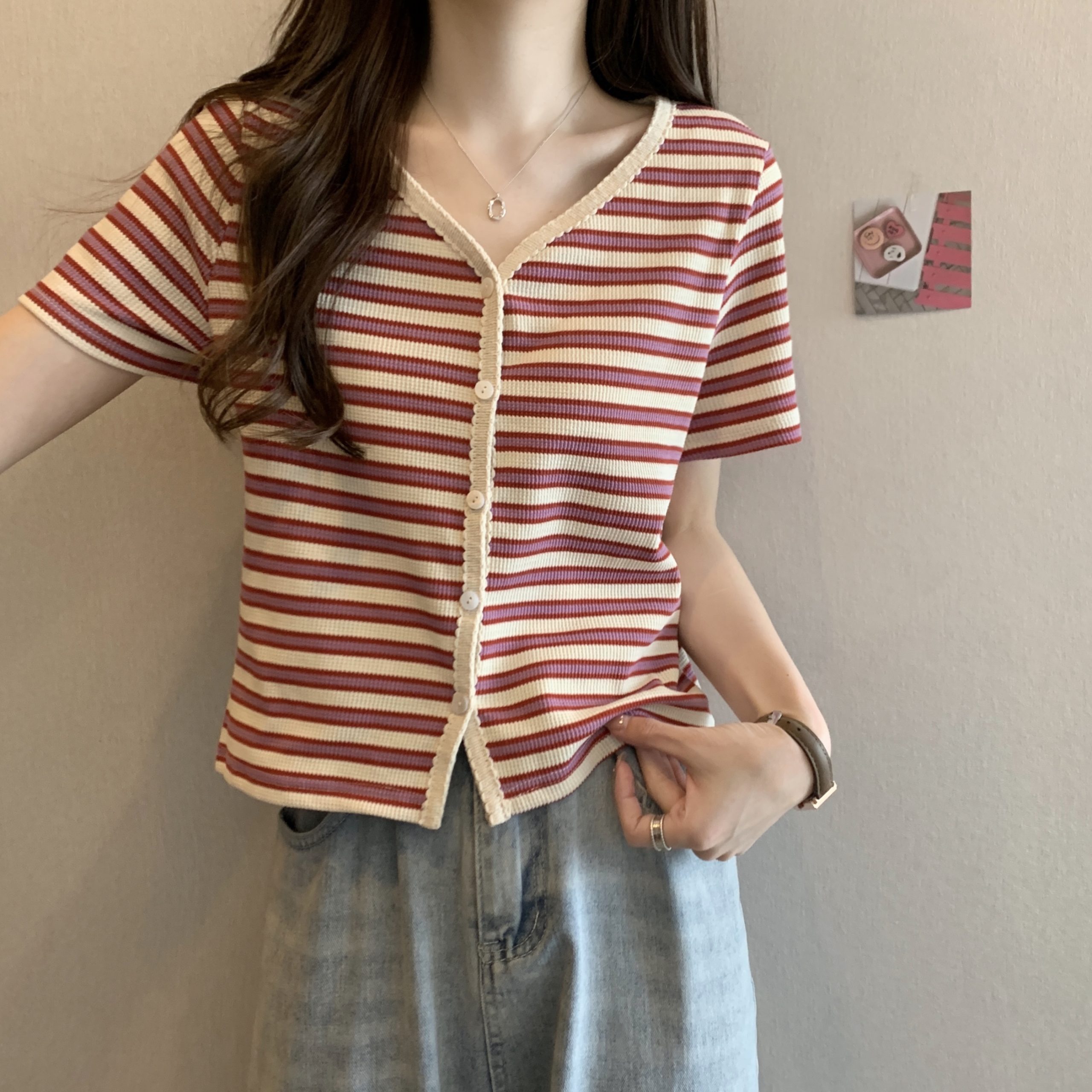 | nameOriginal | Short-sleeved women's 2024 summer new French collarbone V-neck shoulder T-shirt striped slimming short top |