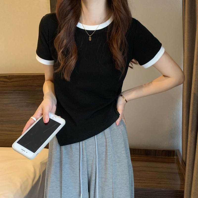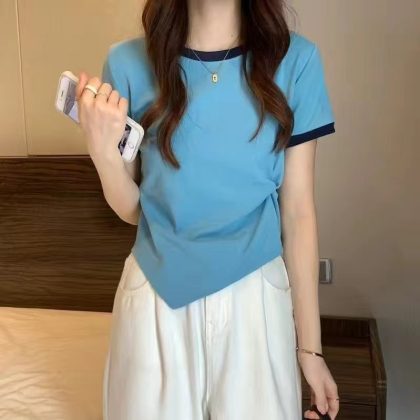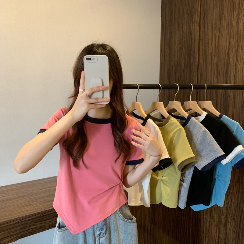 | nameOriginal | Short-sleeved women's summer 2023 design Korean style irregular college style student top short shoulder T-shirt wholesale |