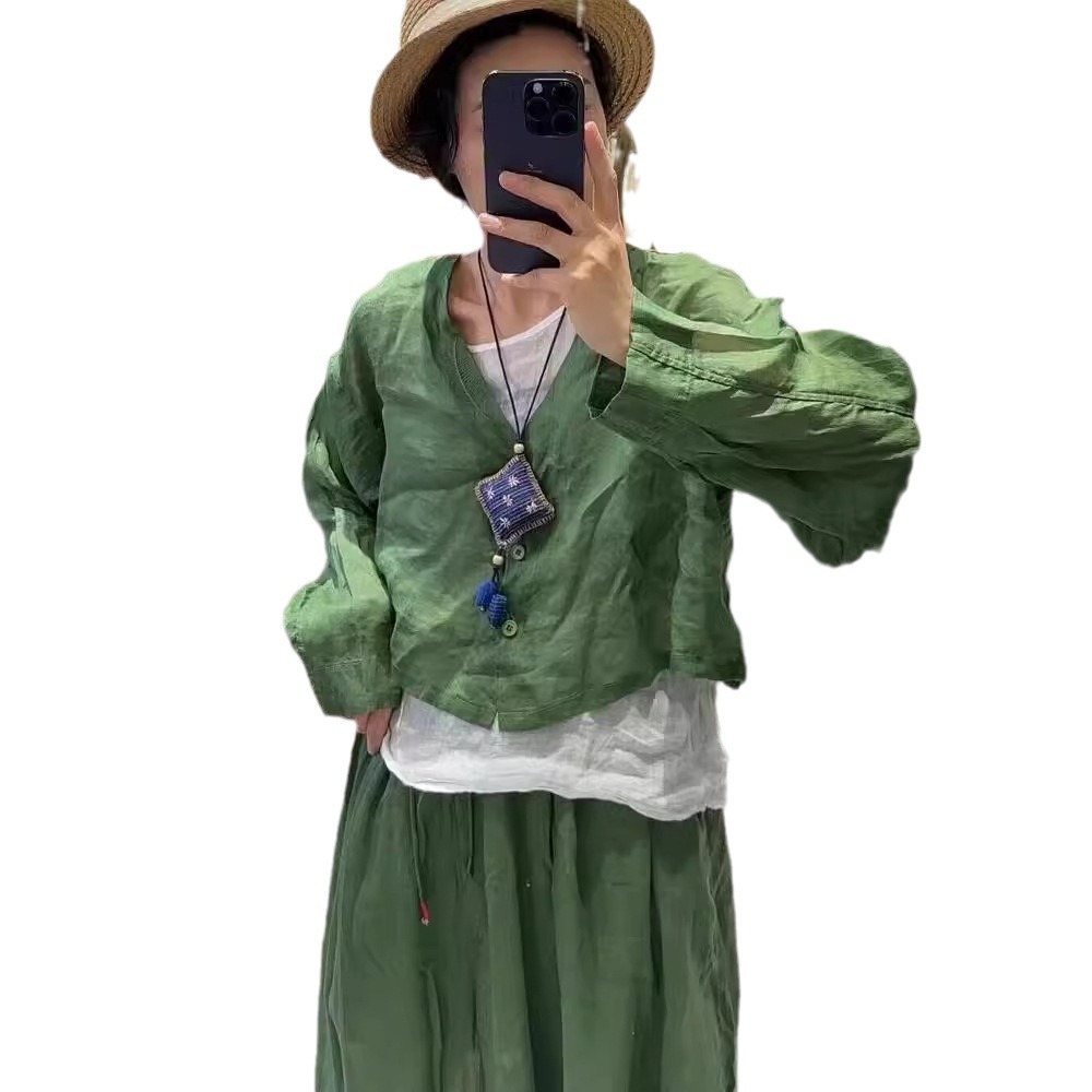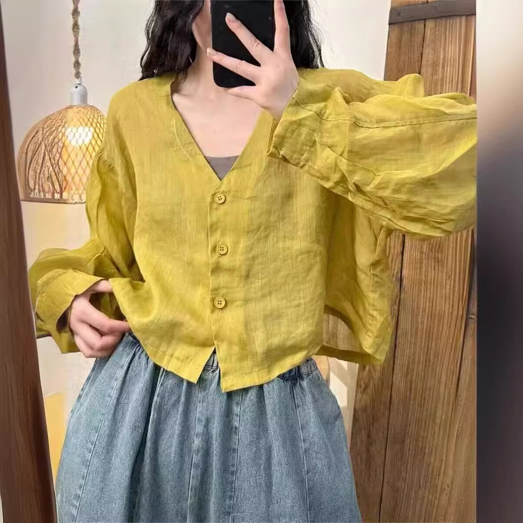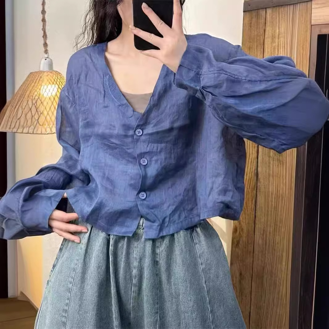 | nameOriginal | Short Sunscreen Shirt Ramie Top High-end 2024 Summer V-neck Loose Slimming Lightweight Embroidered Women's Wear |