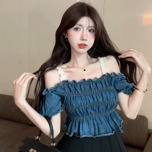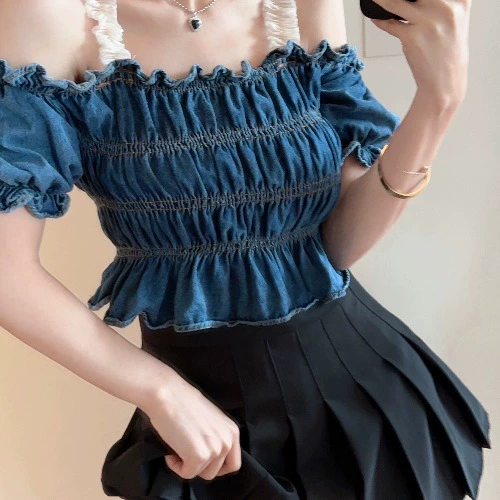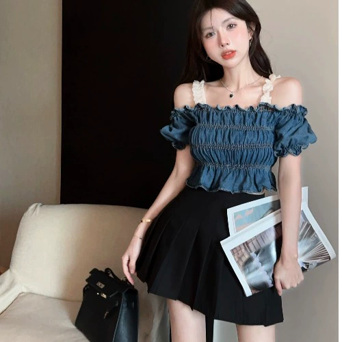 | nameOriginal | Short tops for women 2024 summer off-shoulder straps puff sleeves pleated t-shirt sweet hot girl pure desire pleated skirt two-piece set |