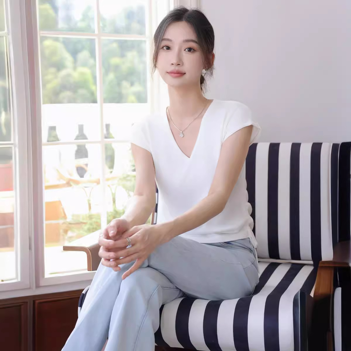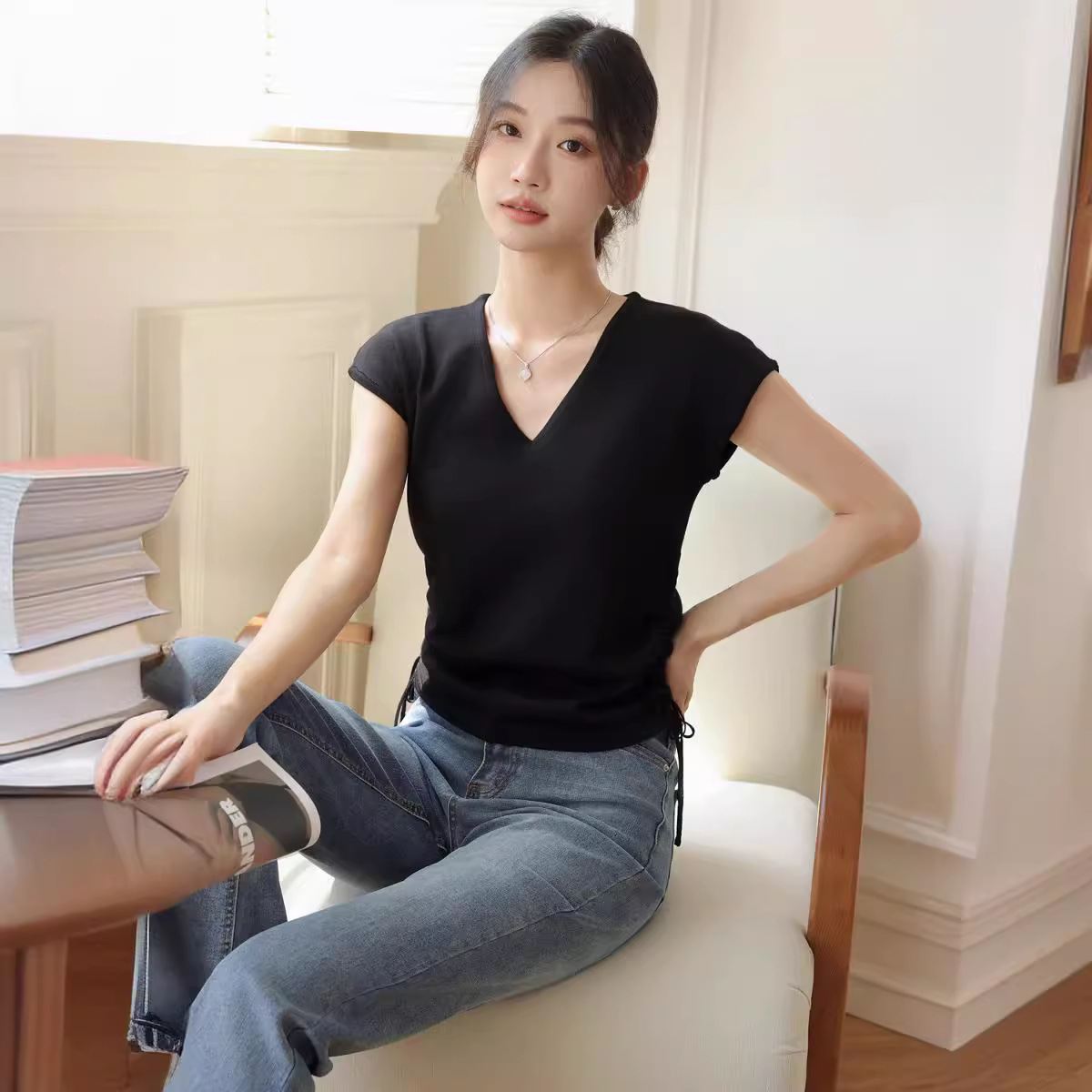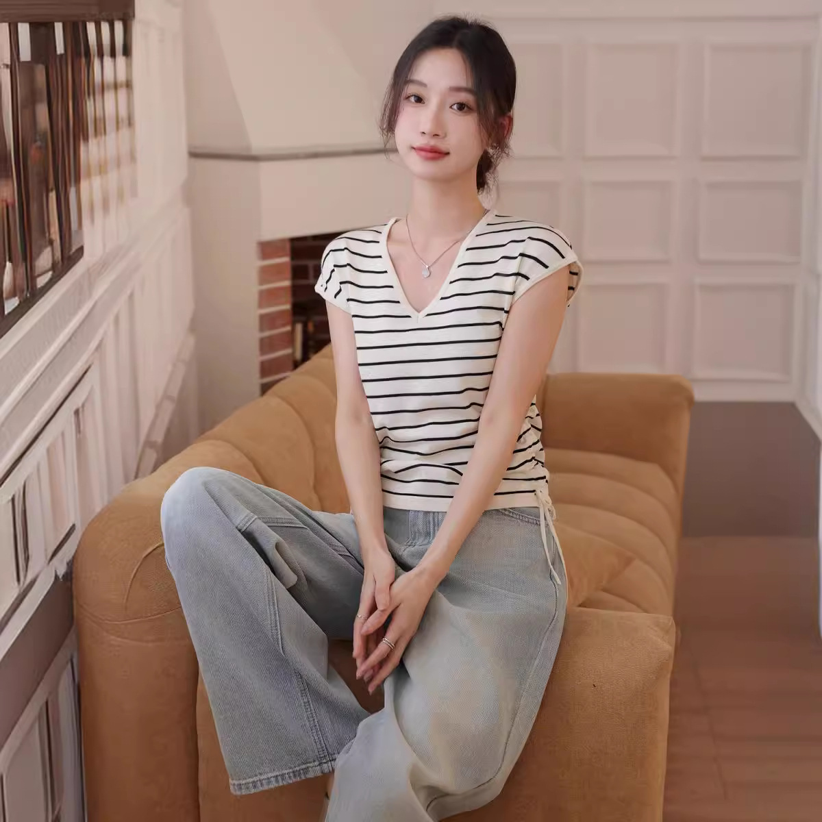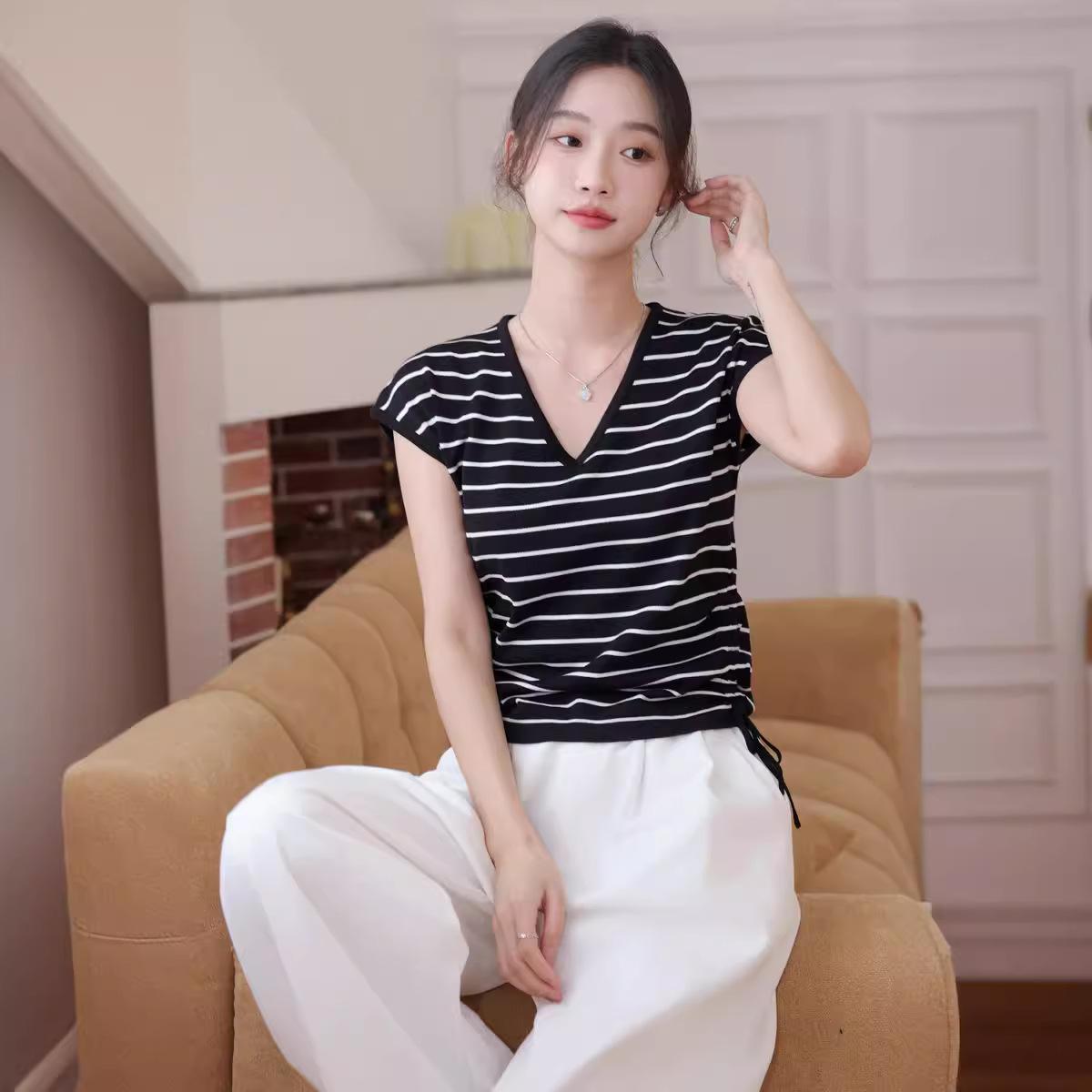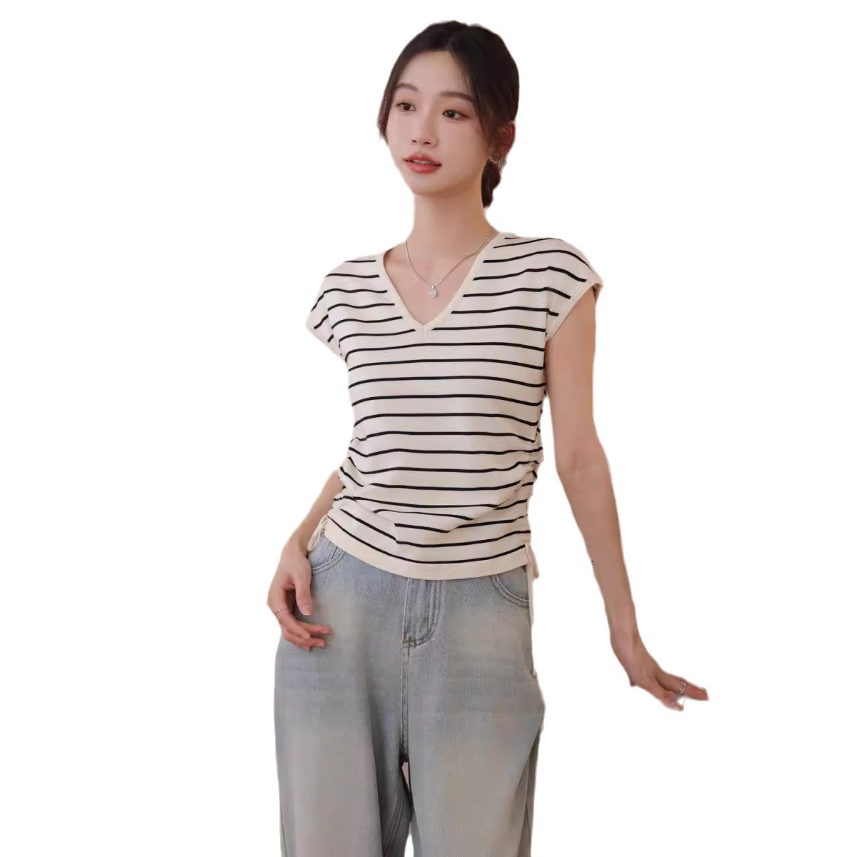 | nameOriginal | Shoulder Fat Slimming Top Design Sense Niche Ice Silk Knitted Sweater Drawstring Chic Striped Short-sleeved T-shirt Women's Summer |