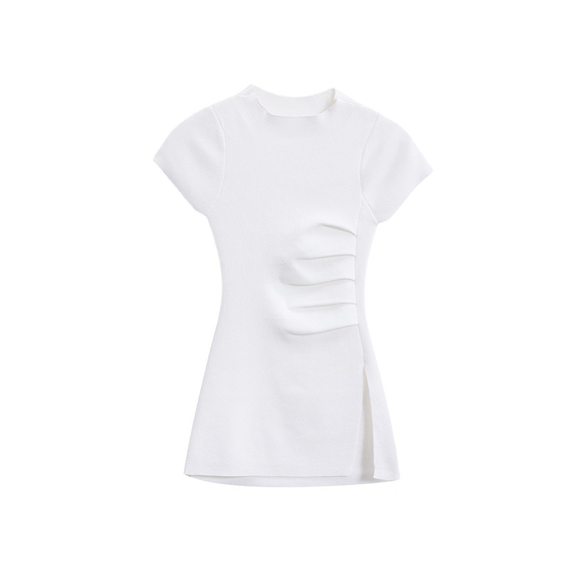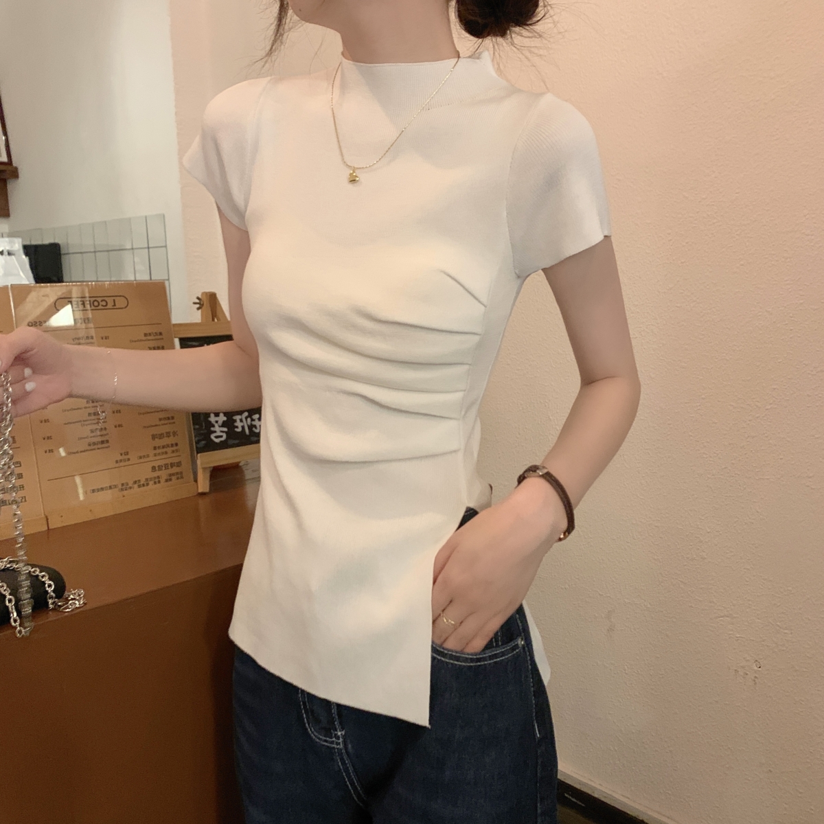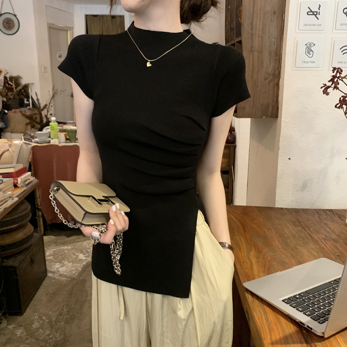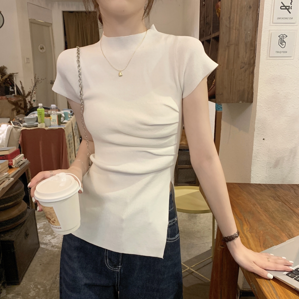 | nameOriginal | Shoulder Half-high Collar Short-sleeved Knitted Top Women's 2024 New Tight Waist Slim-fit Sweet Spice Girl Tight Design Sense Niche |