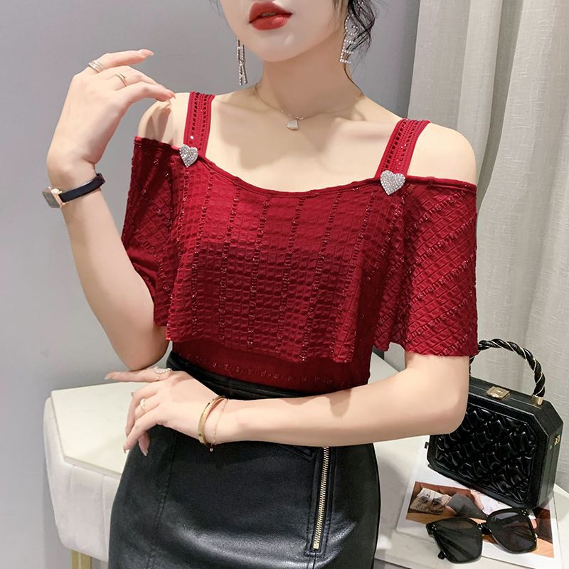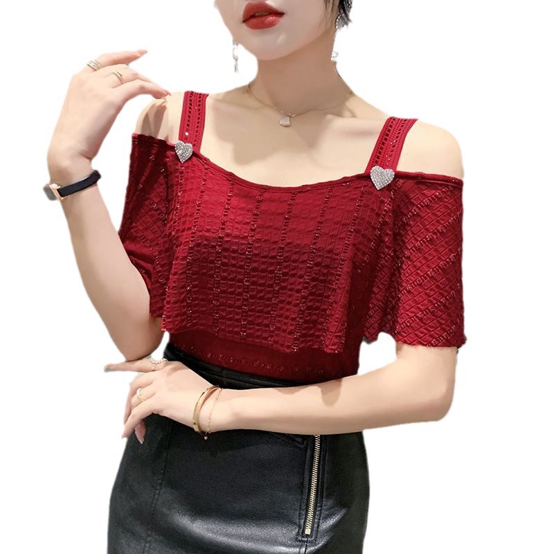 | nameOriginal | Shoulder Short-sleeved T-shirt with Collar Rhinestone Top Sexy New Summer Sling Tight Body-Slimming Base Shirt |