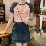 Shoulder Short-sleeved T-shirt Women’s Summer 2024 New Sweet and Cool Design Sense Western Style Slimming Contrast Color Short Hot Girl Top