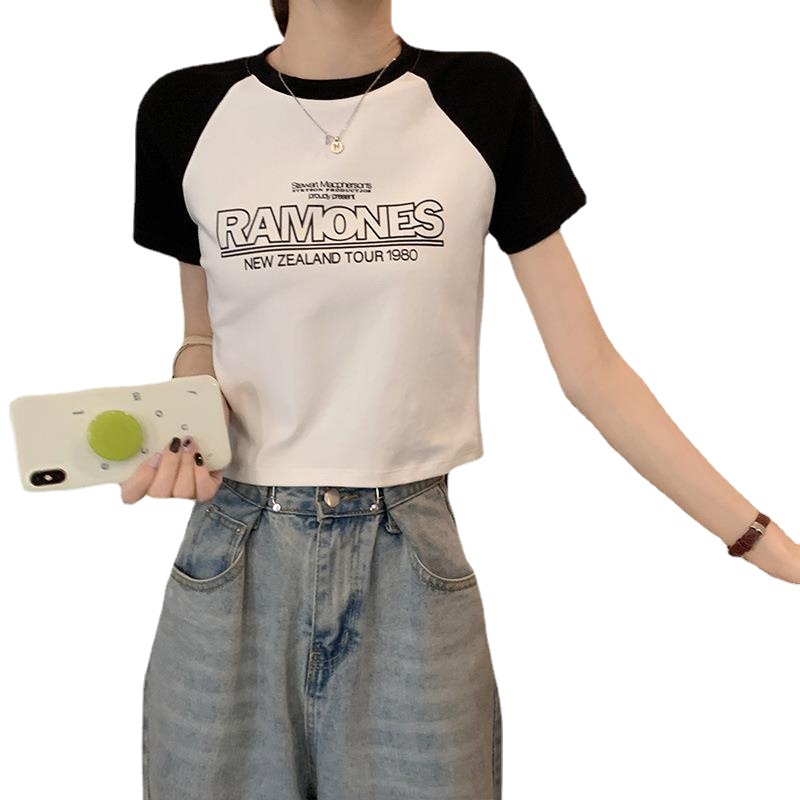 Shoulder Short-sleeved T-shirt Women's Summer 2024 New Sweet and Cool Design Sense Western Style Slimming Contrast Color Short Hot Girl Top