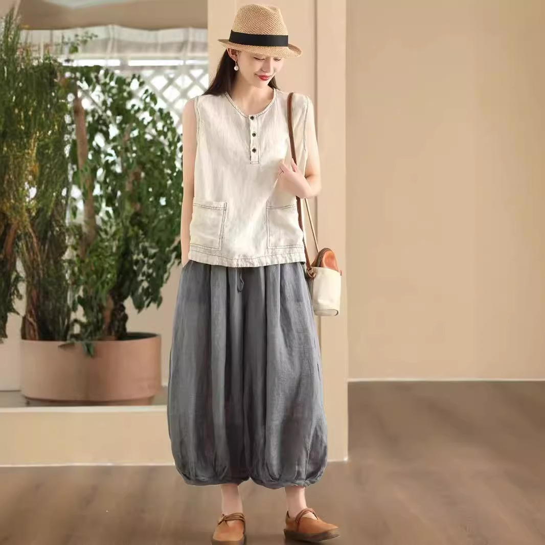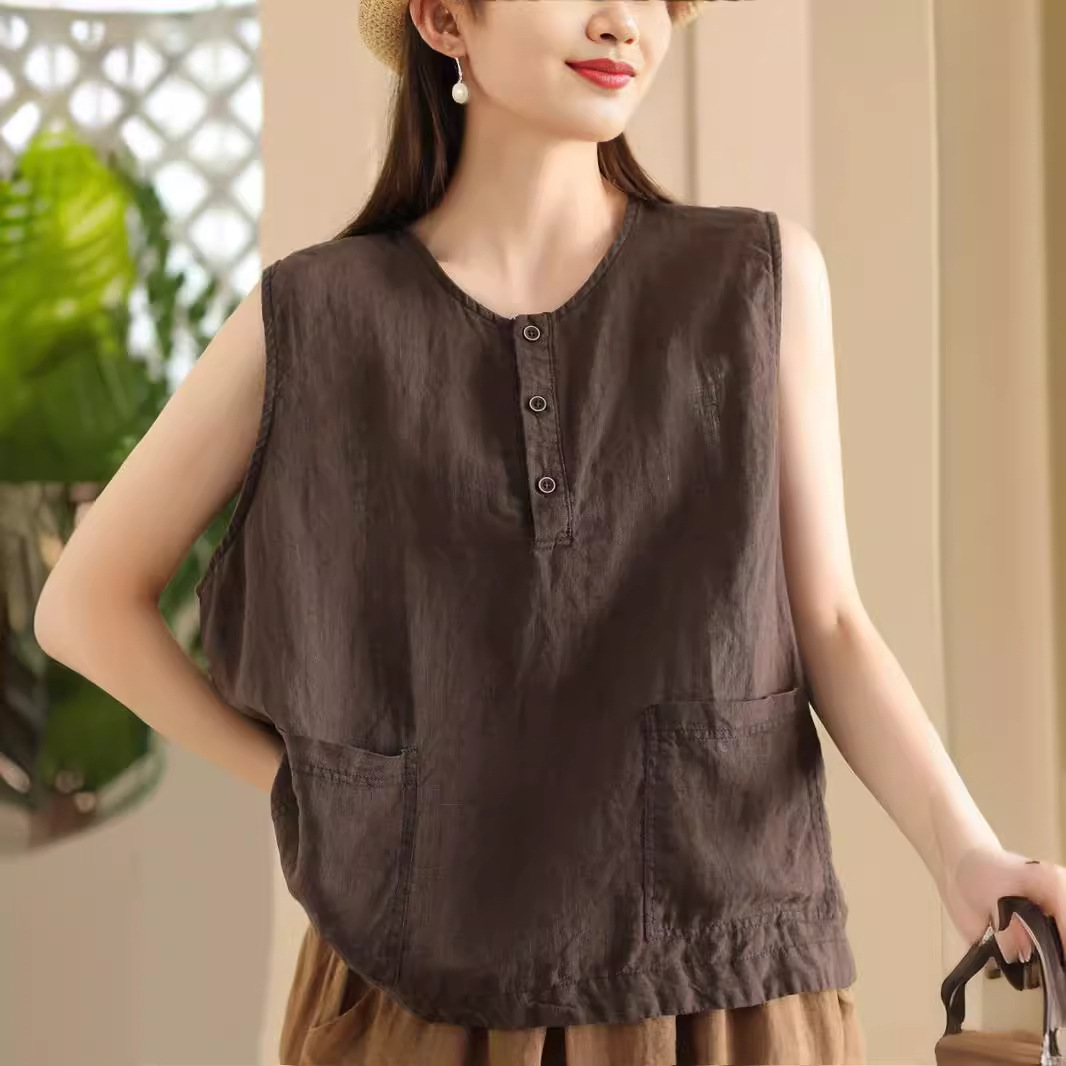 | nameOriginal | Shun Thick Pure Linen Vest Women's Top Line Pocket Round Neck Sleeveless Top Outer Wear Base Inner Summer |