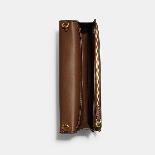 This product is a versatile foldover clutch crossbody made of signature coated canvas and smooth leather. It features eight credit card slots, a full-length bill compartment, an inside zip pocket, and an outside slip pocket. The snap closure ensures the safety of your belongings. The detachable strap with a 23″ drop allows you to wear it as a shoulder or crossbody bag. The dimensions of the bag are 8″ (L) x 4 3/4″ (H) x 1 1/2″ (W).