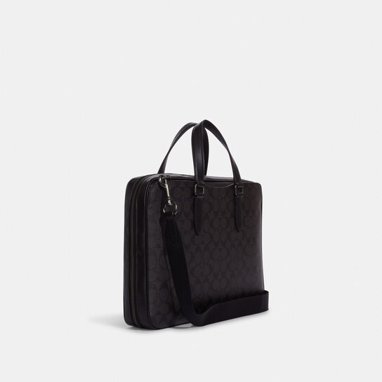 This product features a combination of signature coated canvas and refined calf leather. It includes four slots for credit cards, as well as interior zip and multifunction pockets. The interior also has a secure tab for a laptop sleeve. The product is secured with a zip closure and has fabric lining. It comes with handles that have a 5″ drop, outside snap pockets, and a detachable strap with a 21″ drop for shoulder or crossbody wear. The dimensions of the product are 15 1/2″ (L) x 11″ (H) x 2 1/4″ (W), and its style number is C8172.