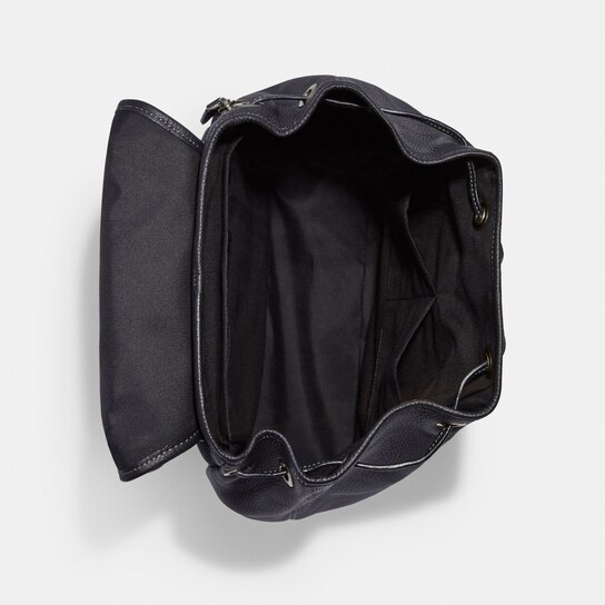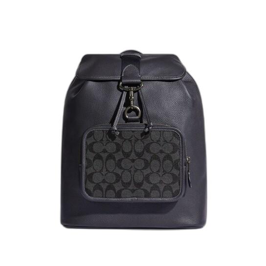 This product features a combination of signature coated canvas and refined pebble leather. It includes various pockets such as an inside zip, cell phone, and multifunction pockets, as well as an inside laptop sleeve. The closures consist of drawstring and dogleash clips, with a fabric lining. The product also has a handle with a 2 1/4″ drop, an outside zip pocket, and outside zip access to the interior. The adjustable shoulder straps provide comfort and convenience. The dimensions of the product are 11 3/4″ (L) x 16 1/2″ (H) x 5 1/2″ (W), and the style number is C9864.