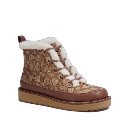 This product features a combination of signature jacquard and leather materials in its upper portion. The lining is made of faux shearling and man-made leather, while the footbed is made of man-made leather. The outsole is made of rubber and the product can be easily pulled on. It has a 6 1/2″ height shaft and a 12 1/4″ circumference. The heel measures 1″. The product is identified as Style No. CC764.