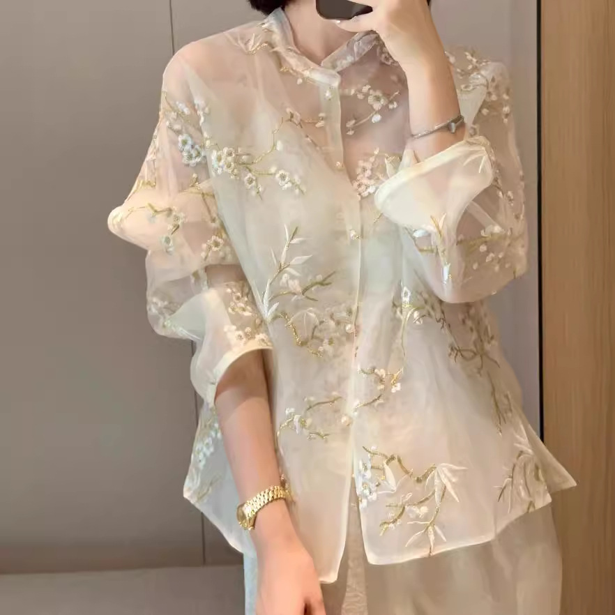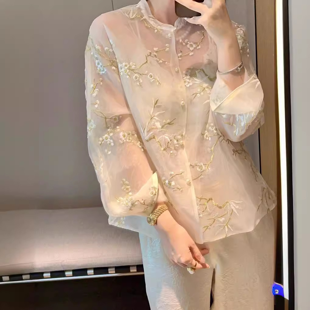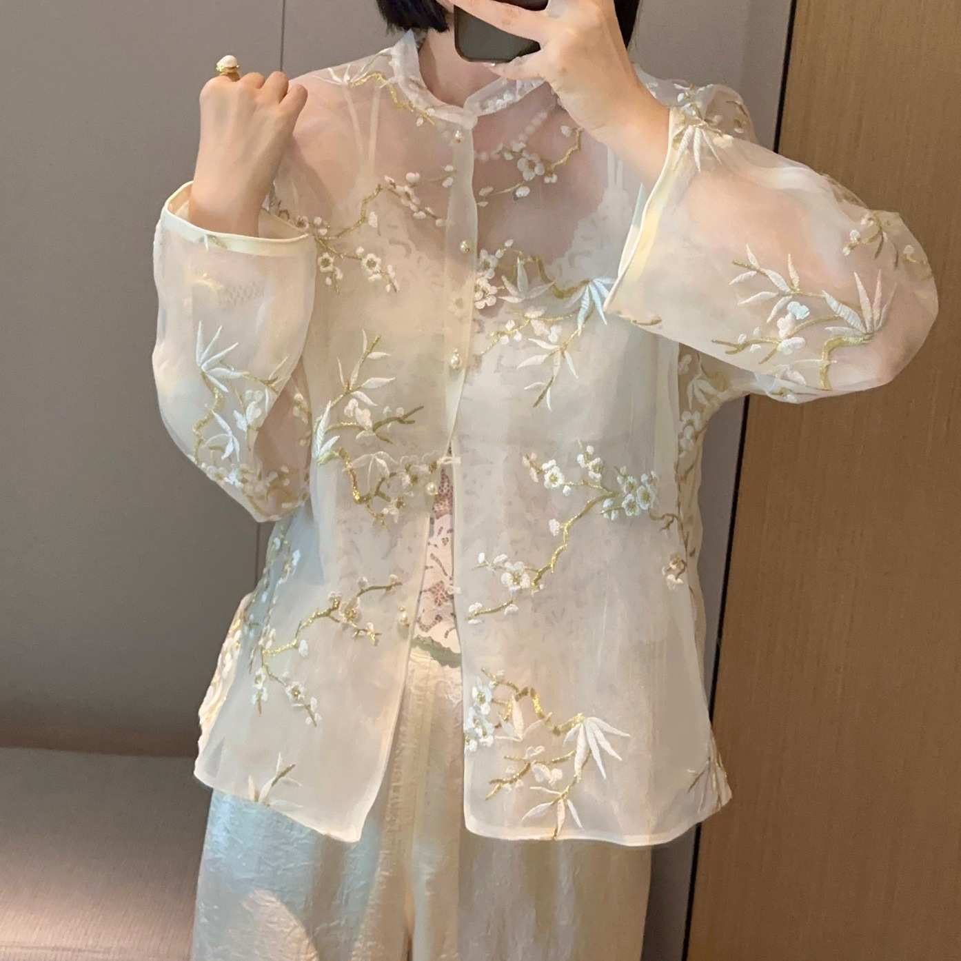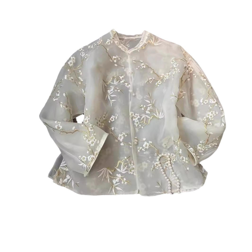 Silk Organza Heavy Industry Embroidered Sunscreen Top New Chinese Style Vertical Collar Pearl Buckle Design Light and Thin Perspective Outer Wear