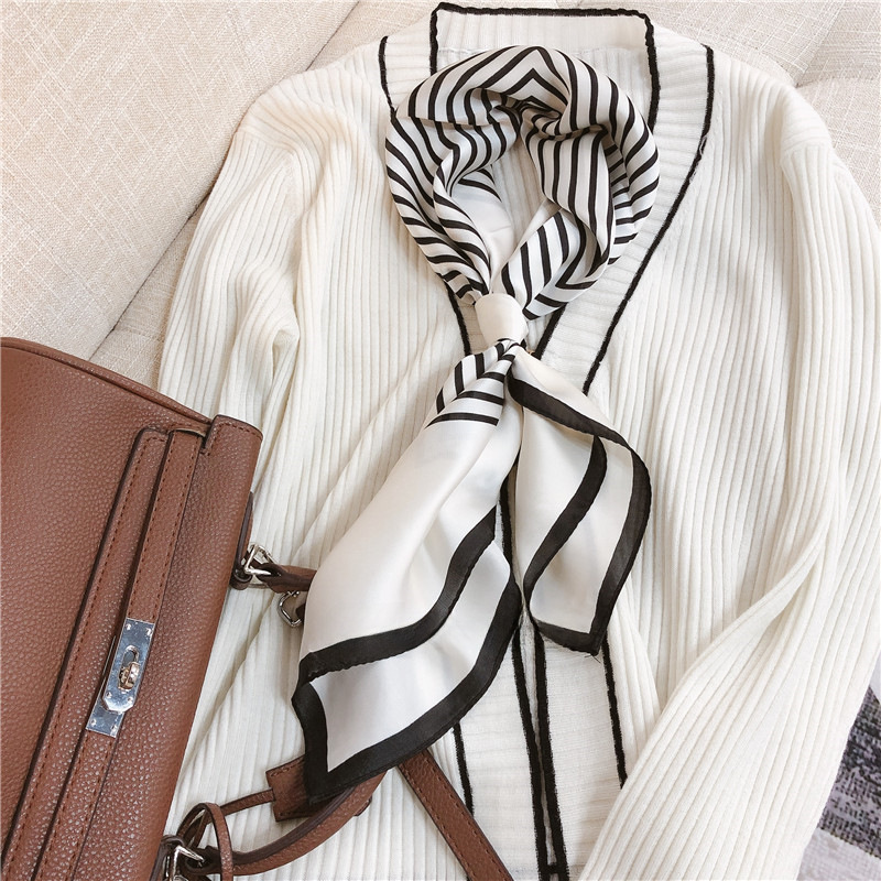 Silk Scarf Square Scarf Advanced Sense Black and White Stripe Printed Imitation Silk 70 Small Square Scarf Ins Style Simple Gift Box Scarf