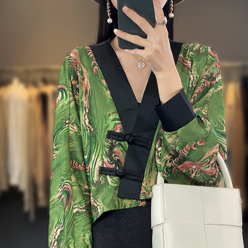 | nameOriginal | Silk Silk 2024 Spring and Summer Women's New Short Loose Vintage Buckle Printed Long Sleeve Shawl Coat Sunscreen Top |