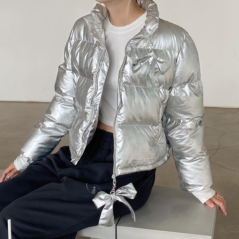 | nameOriginal | Silver glossy bread coat for Women American style 2023 autumn and winter new solid color cardigan zipper stand collar warm cotton-padded coat |