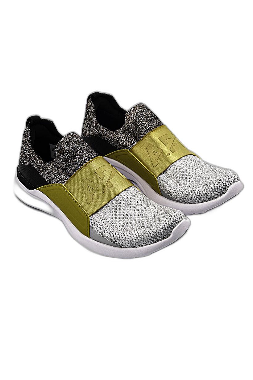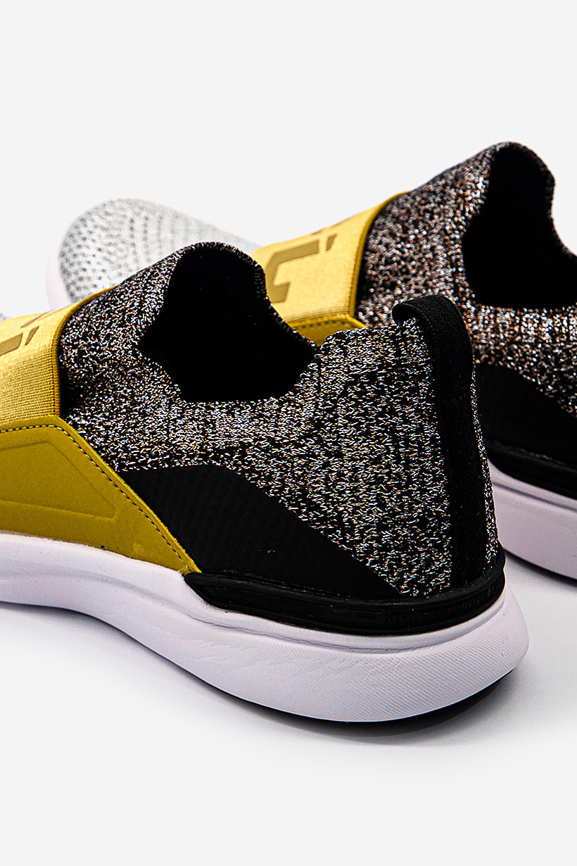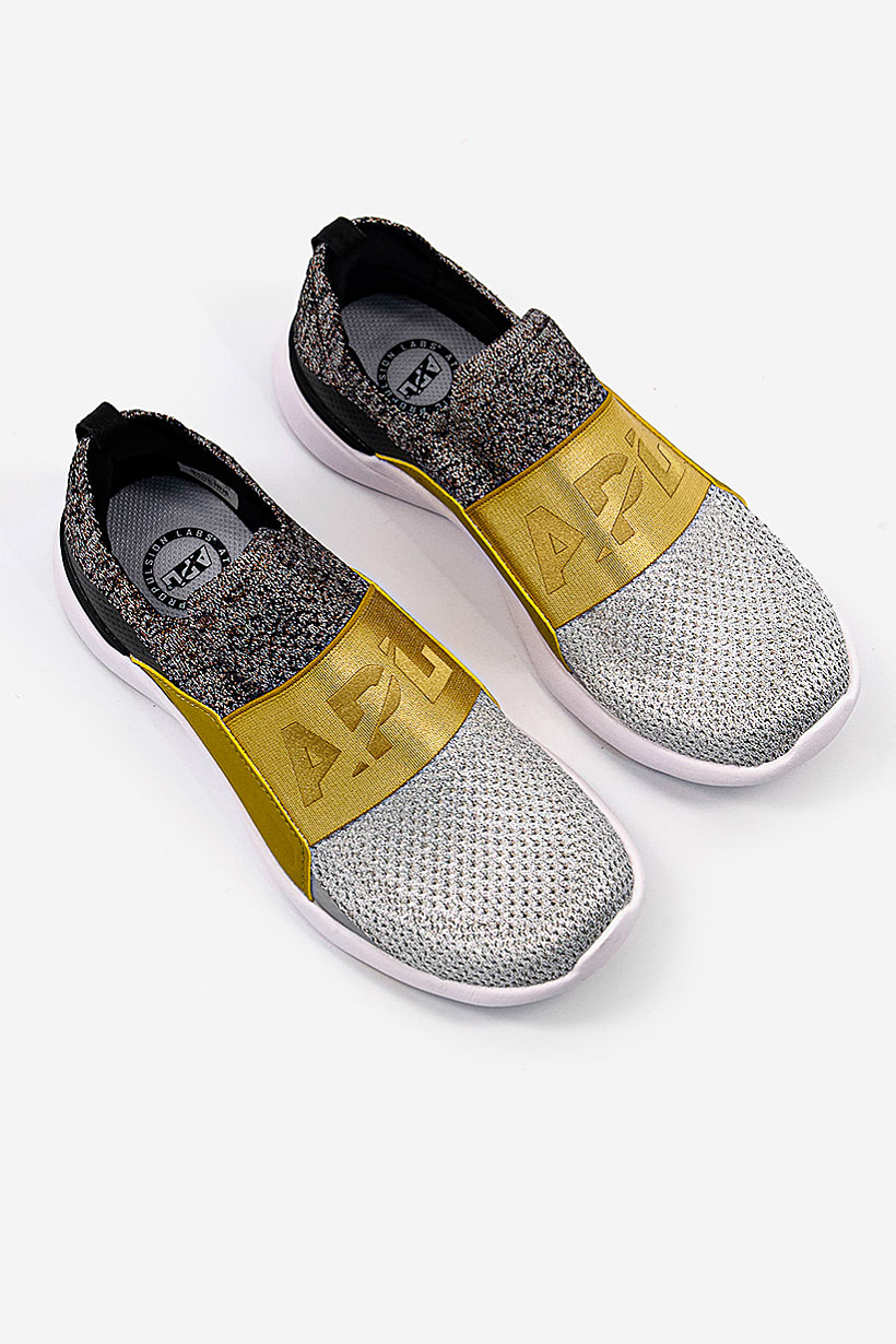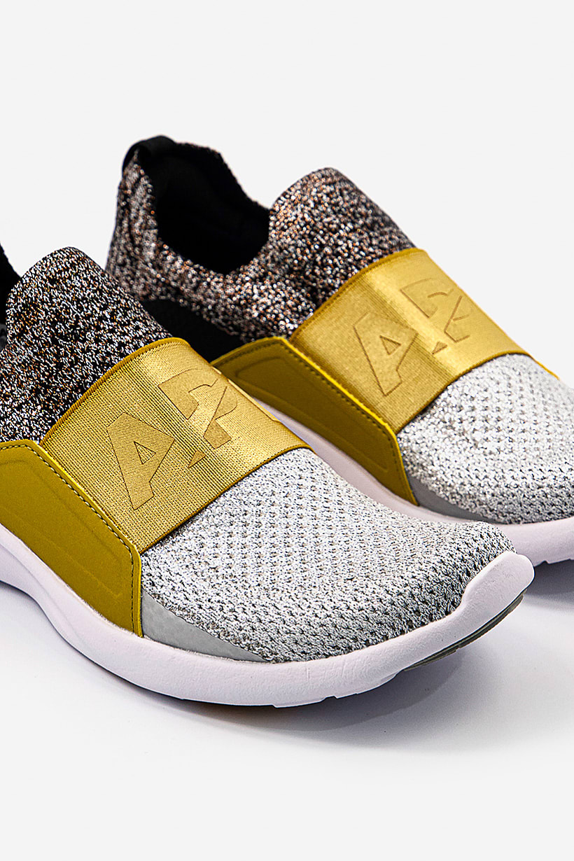 Silver, gold, and black metallic training shoes for women with Techloom Bliss design.