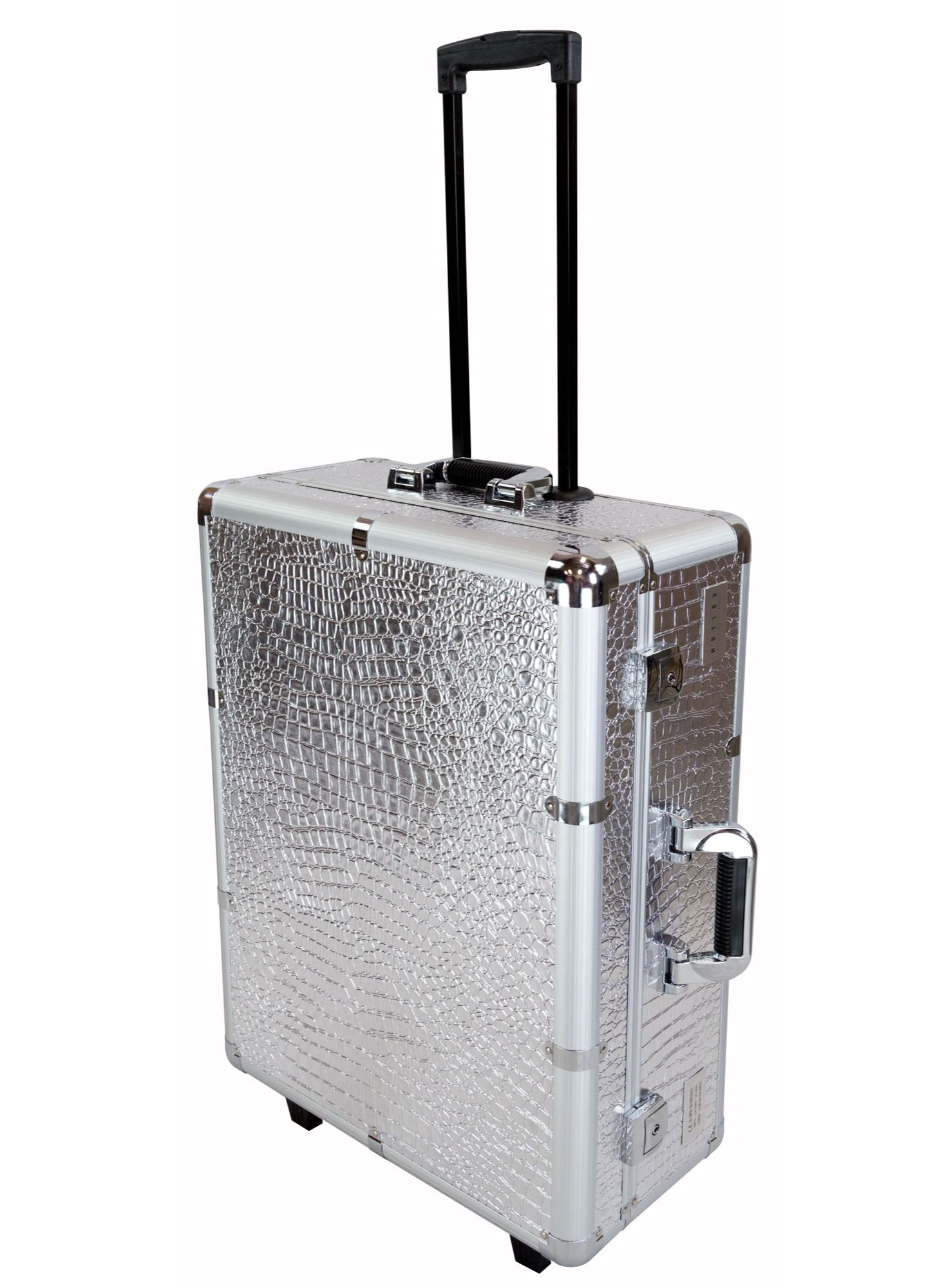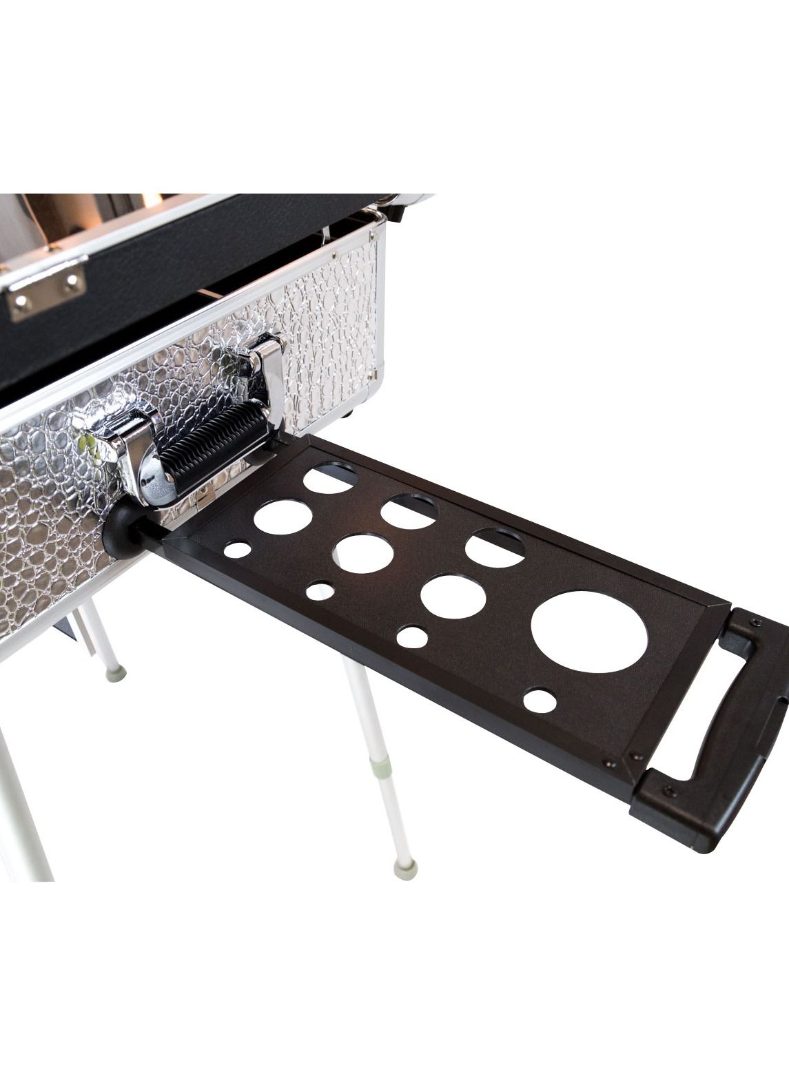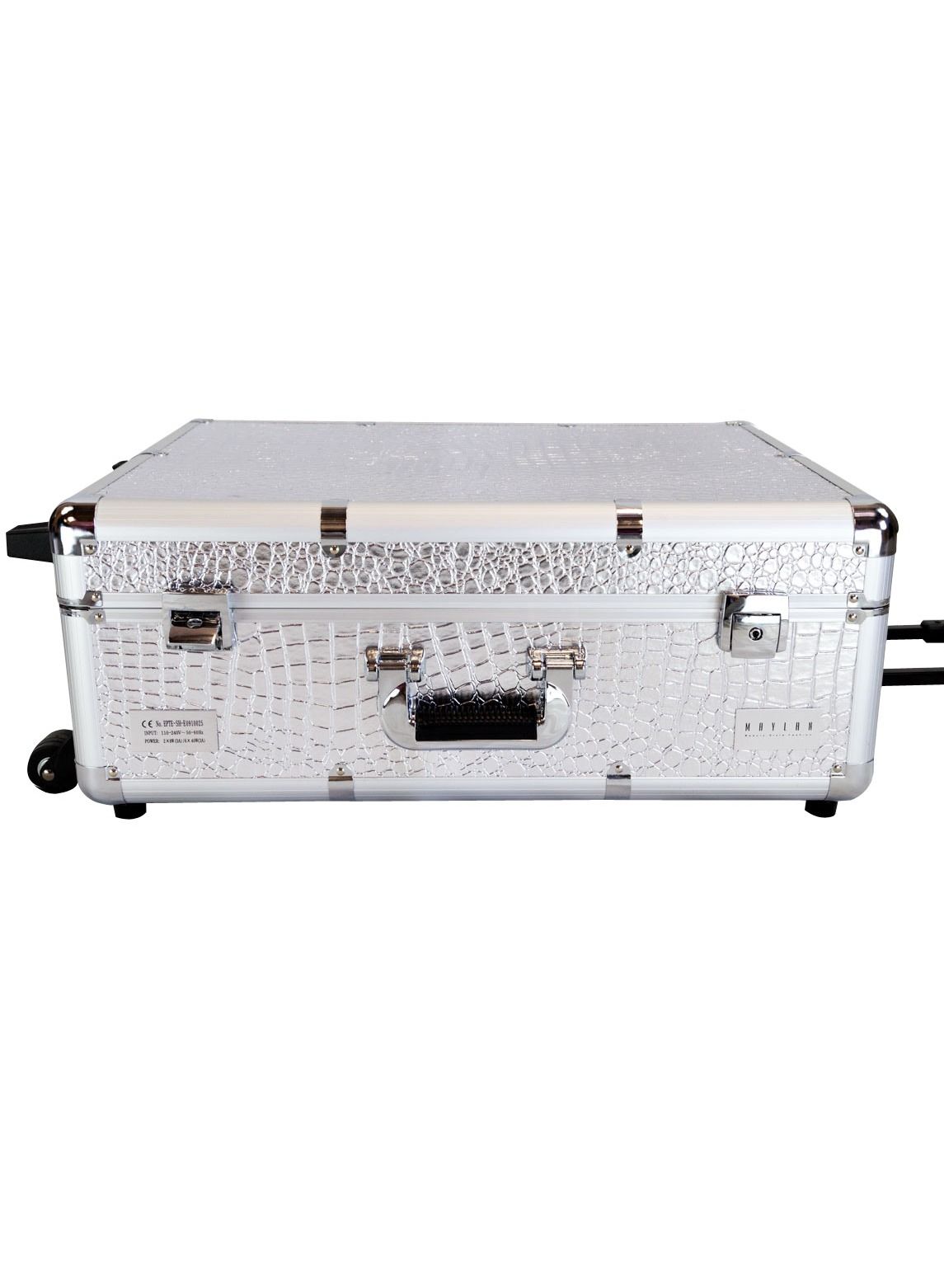 The Maylan Makeup Train Stand Case with Pro Studio Artist Trolley and Lights in Silver Medium is the ultimate solution for professional makeup artists and beauty enthusiasts alike. This versatile and stylish case features a spacious interior with multiple compartments and trays to keep all your makeup and tools organized and easily accessible. The case also comes with a sturdy stand that allows you to work comfortably at any height, and a convenient trolley with wheels for easy transport.