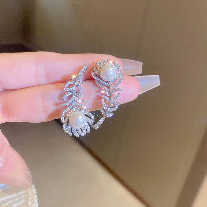 | nameOriginal | Silver needle high-end full diamond zircon asymmetric feather leaf pearl earrings fashionable temperament earrings light luxury earrings |