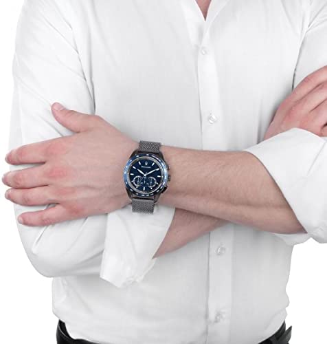 Introducing the Traguardo Collection Men’s Watch, a stunning timepiece that combines style and functionality. This watch features a precise quartz movement and a chronograph function, allowing you to keep track of time with ease. The gun PVD Milanese mesh band bracelet adds a touch of sophistication to the watch, making it perfect for any occasion. The silver color of the watch and bracelet complements any outfit, making it a versatile accessory for any wardrobe. With its sleek design and durable construction, this watch is sure to become a staple in your collection. Don’t miss out on the opportunity to own this exceptional timepiece.