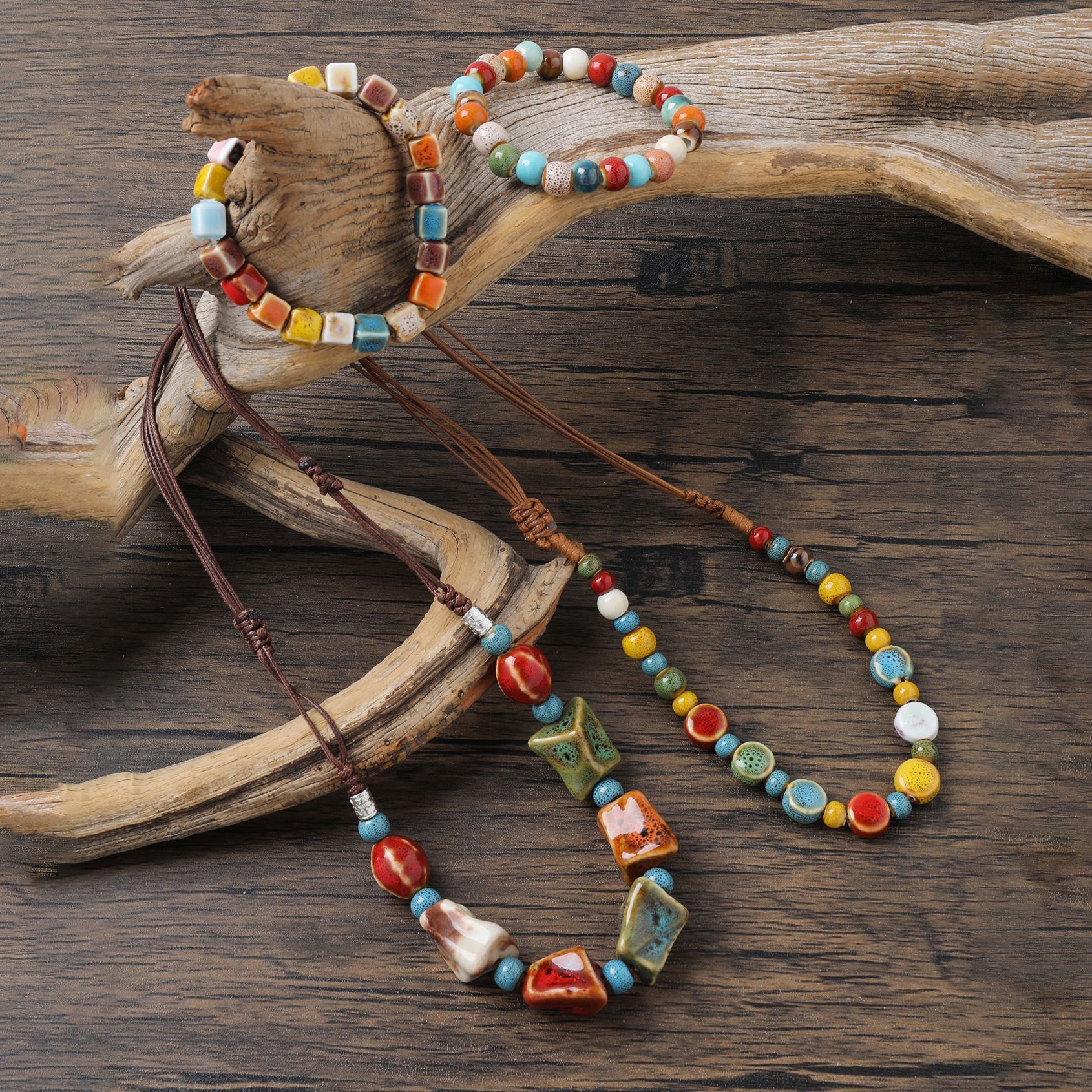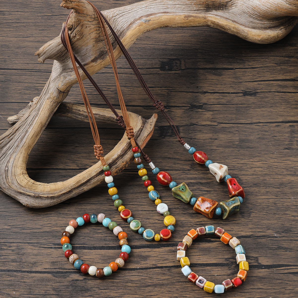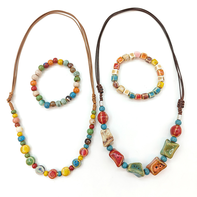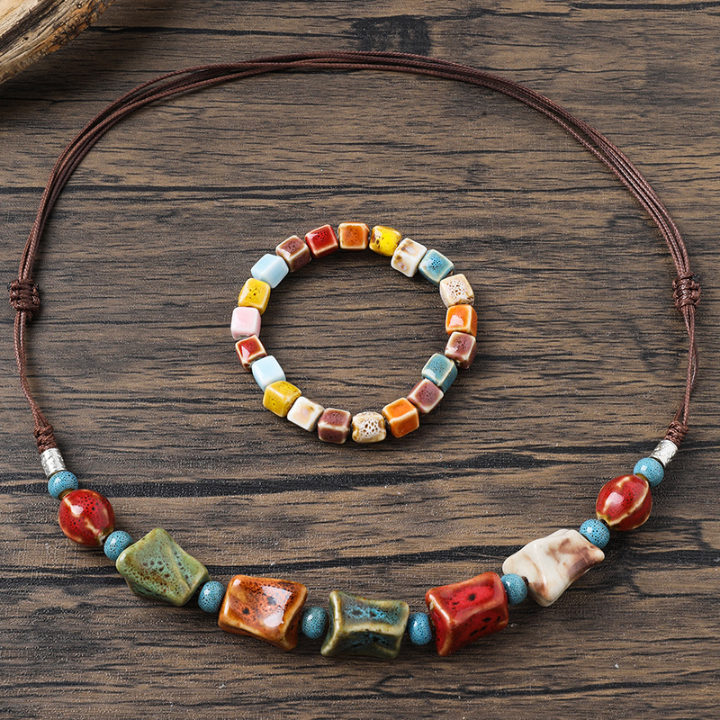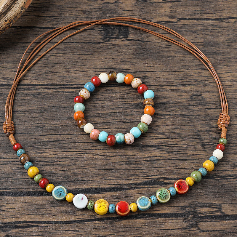 Simple Retro Ethnic Style High Quality Ceramic Necklace Bracelet Set Hand-woven Beaded Adjustable Necklace